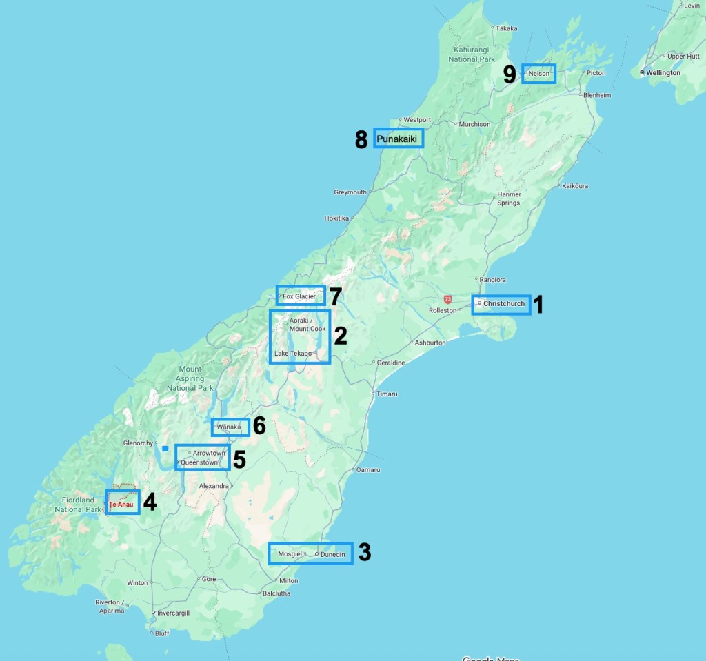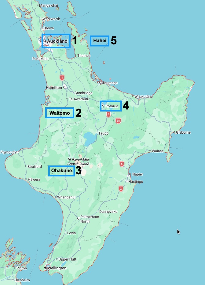 Below is a quick overview of our route. We will be driving the entire time, starting on the North Island for 10 days, then on to the South Island for a longer stay. All destination drives will be less than 3.5 hours, except the Wanaka to Fox Glacier leg and all our lodging will be AirBnbs with full kitchens.