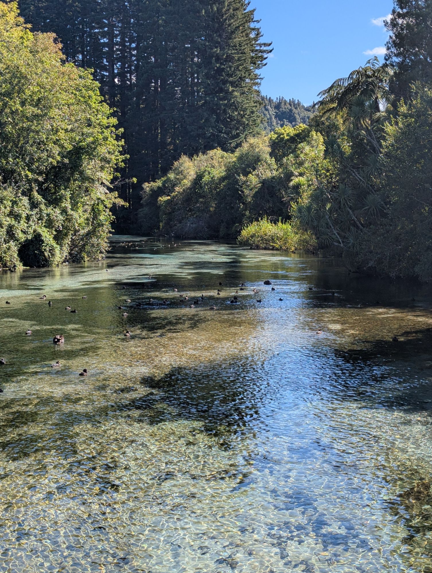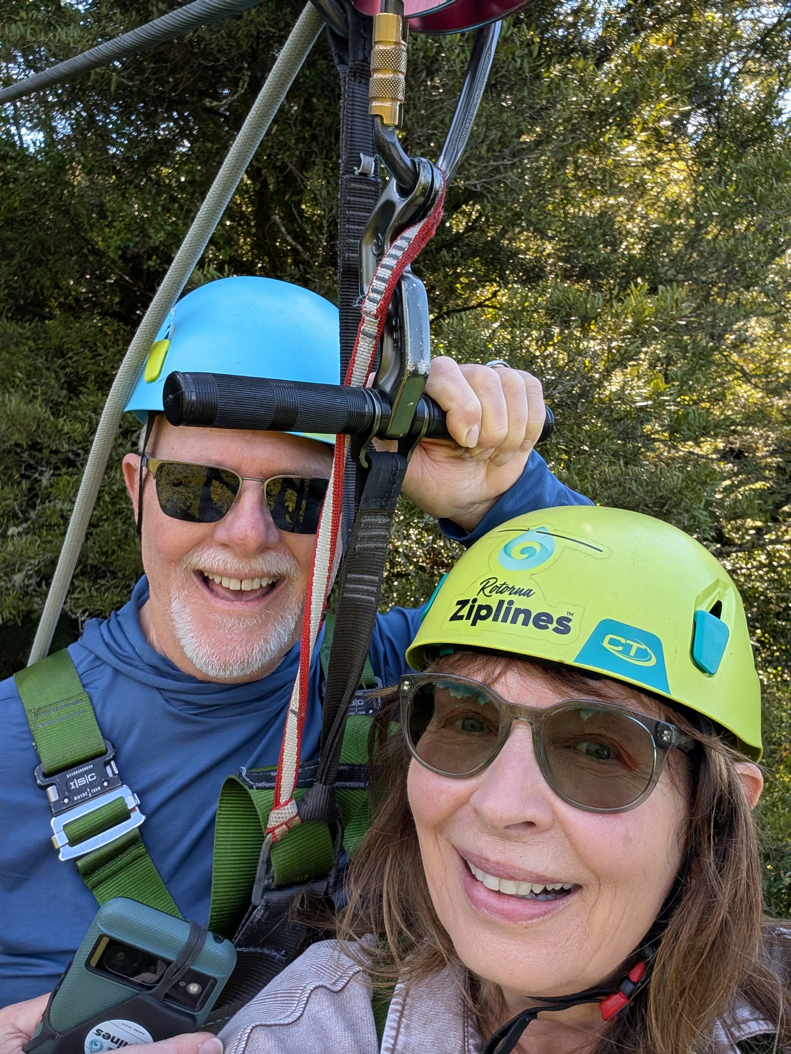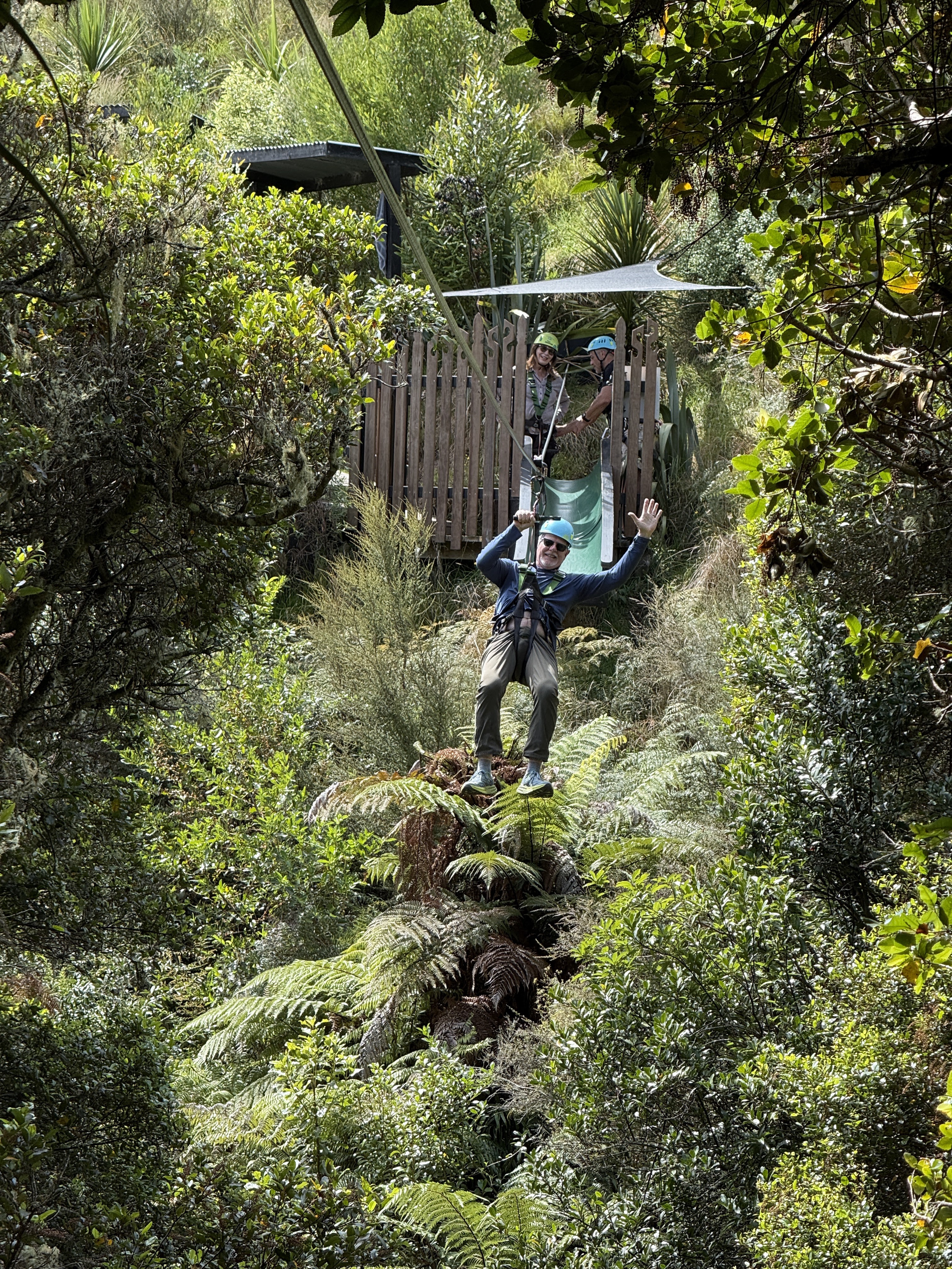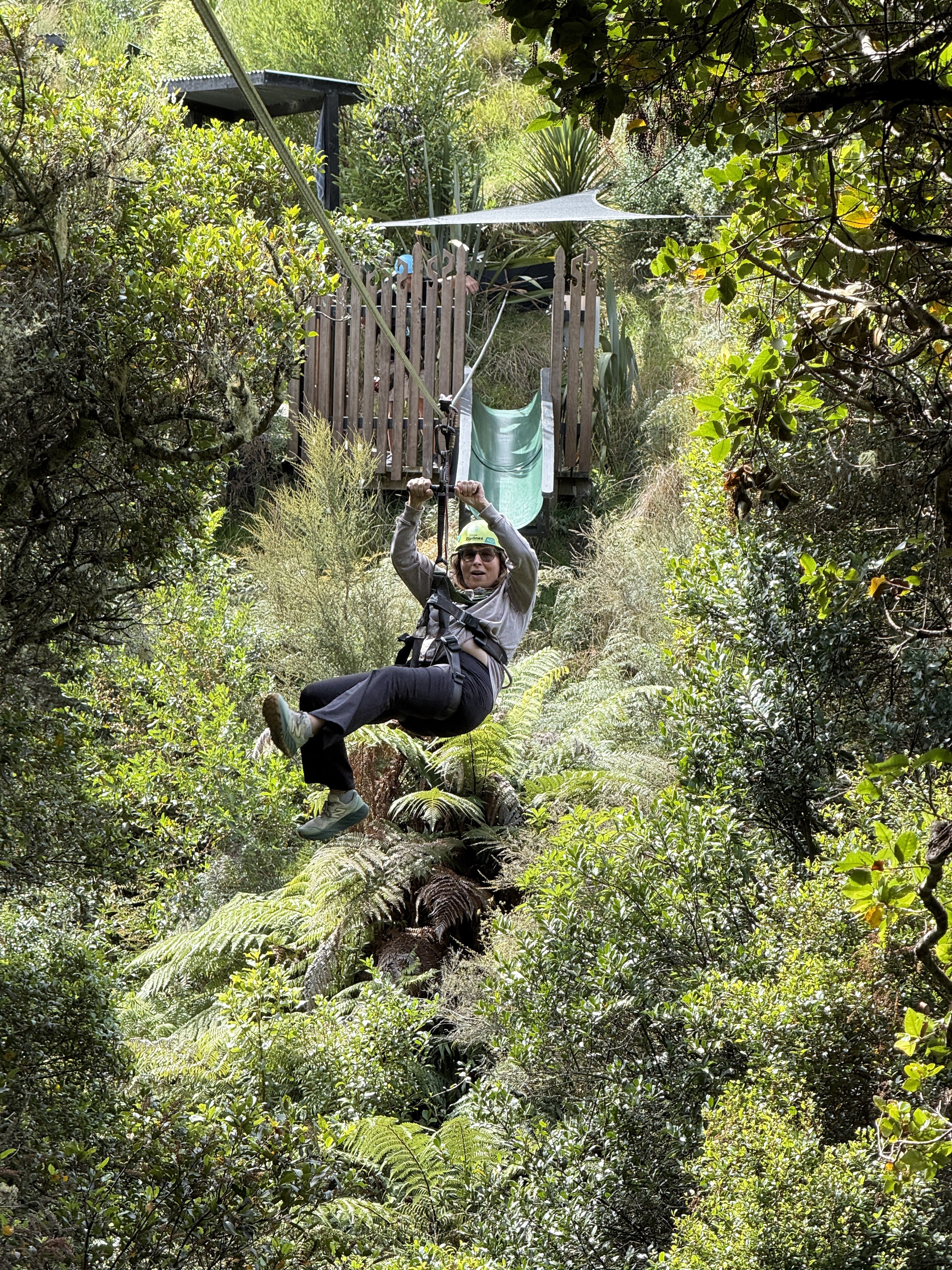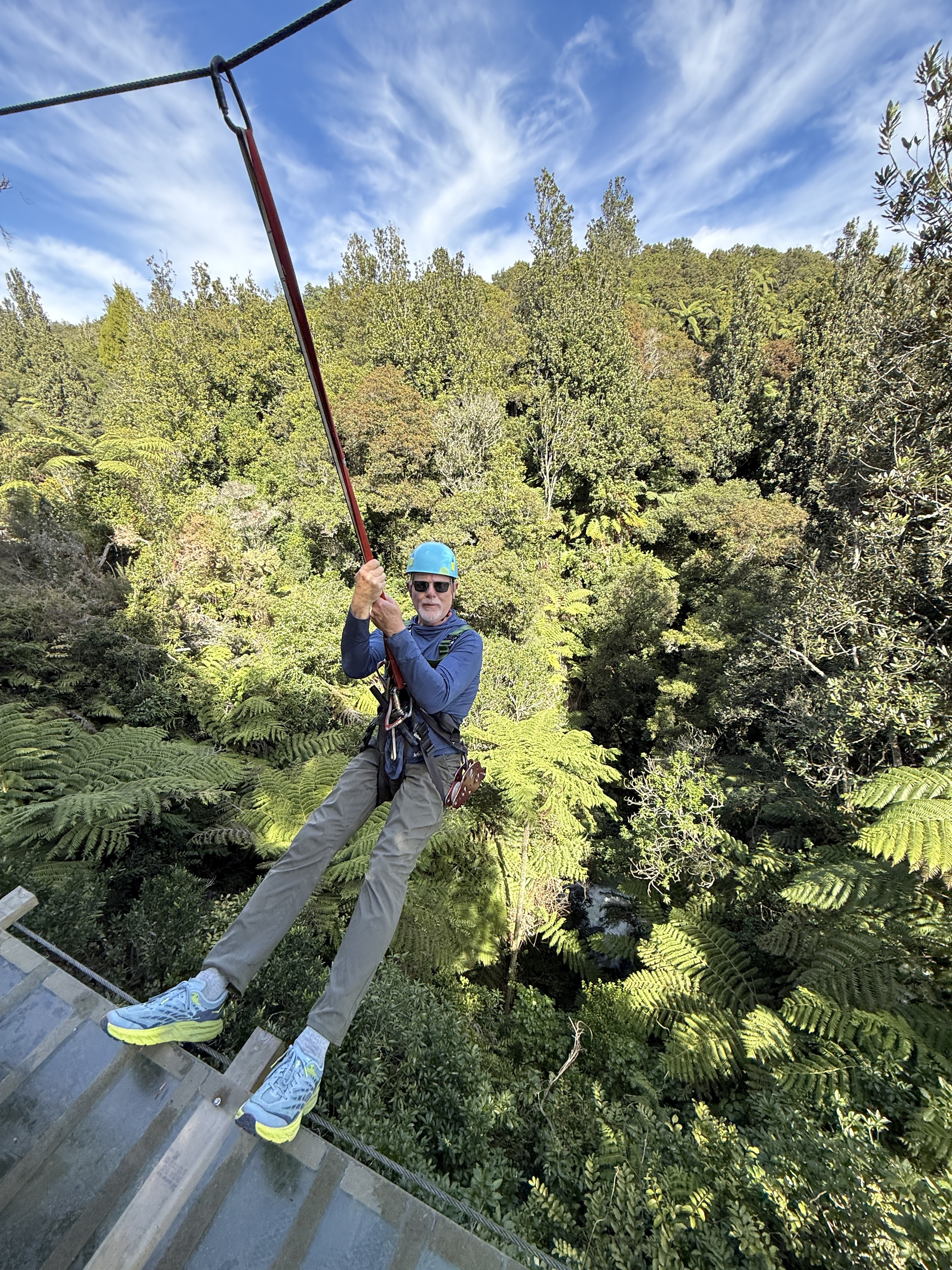 Hold on. How old are you two? We played all day. First, a two hour zip-line adventure through a tropical forest. We had two guides all to ourselves learning about the history of the Māori culture as we walked through the forest. Between learning what plants were edible and the significance of the Silver Fern, we flung ourselves down four separate zip lines with waterfalls below. We also trekked over a very high, but rustic wooden bridge. By the end of the morning, John no longer carried a life long fear of heights. How did that happen? In the afternoon we went separate ways for a bit. Kate went to a lakeside spa for a massage and a soak in mineral pools. John went to Rotorua Skyline to luge down a steep track. The track is reached by riding a gondola up and go-carting down. Then back up again. In the evening we dined at home. Right before bed, the sky cleared and the stars showed more constellations. Tuesday morning, on the way out of town, we stopped at a local secret wellspring, for a walk among the 100 year redwoods. This forest was planted after WWI as a memorial to those lost. It’s extraordinary to see our California Redwoods growing tall among tropical palms.