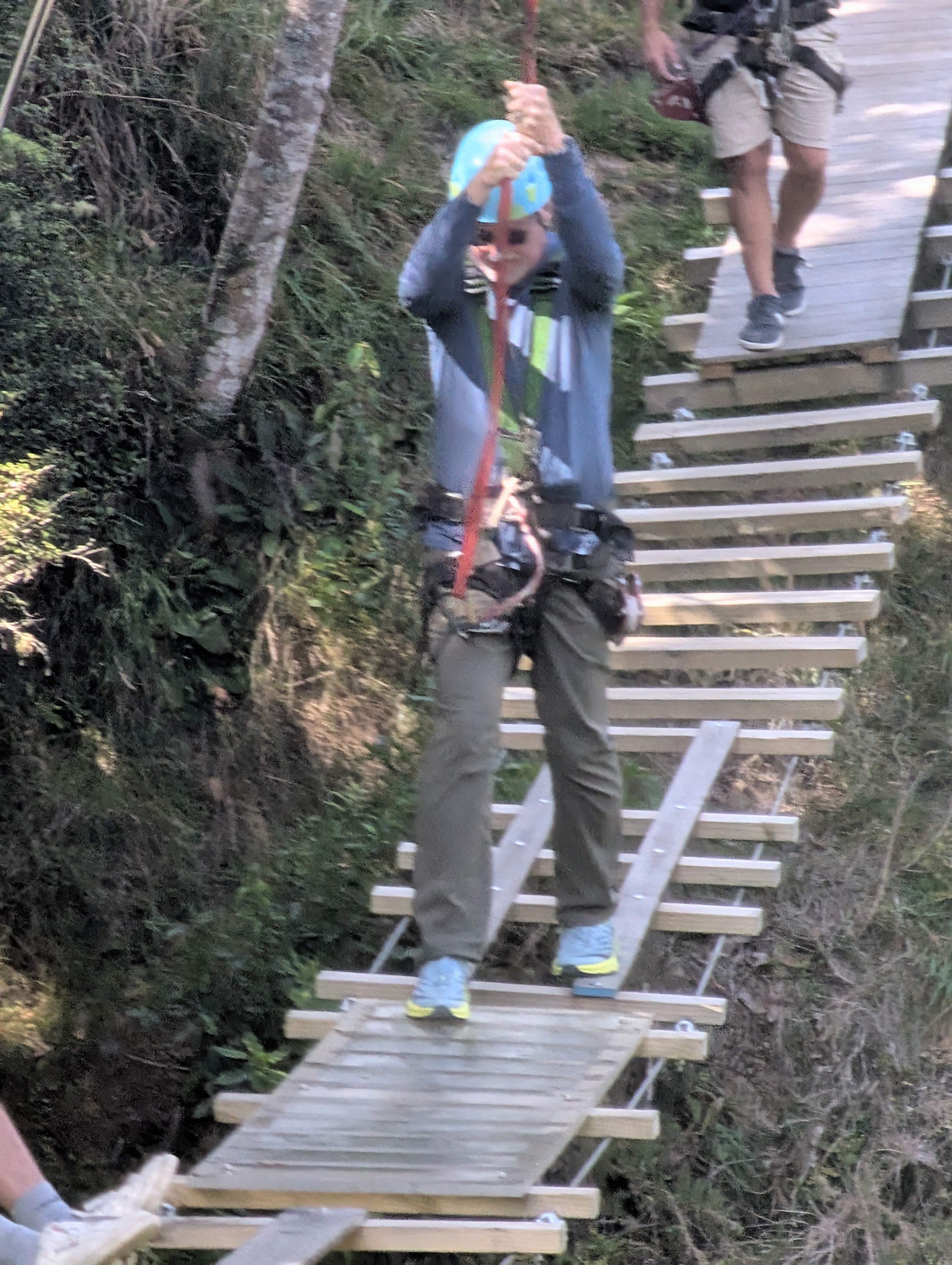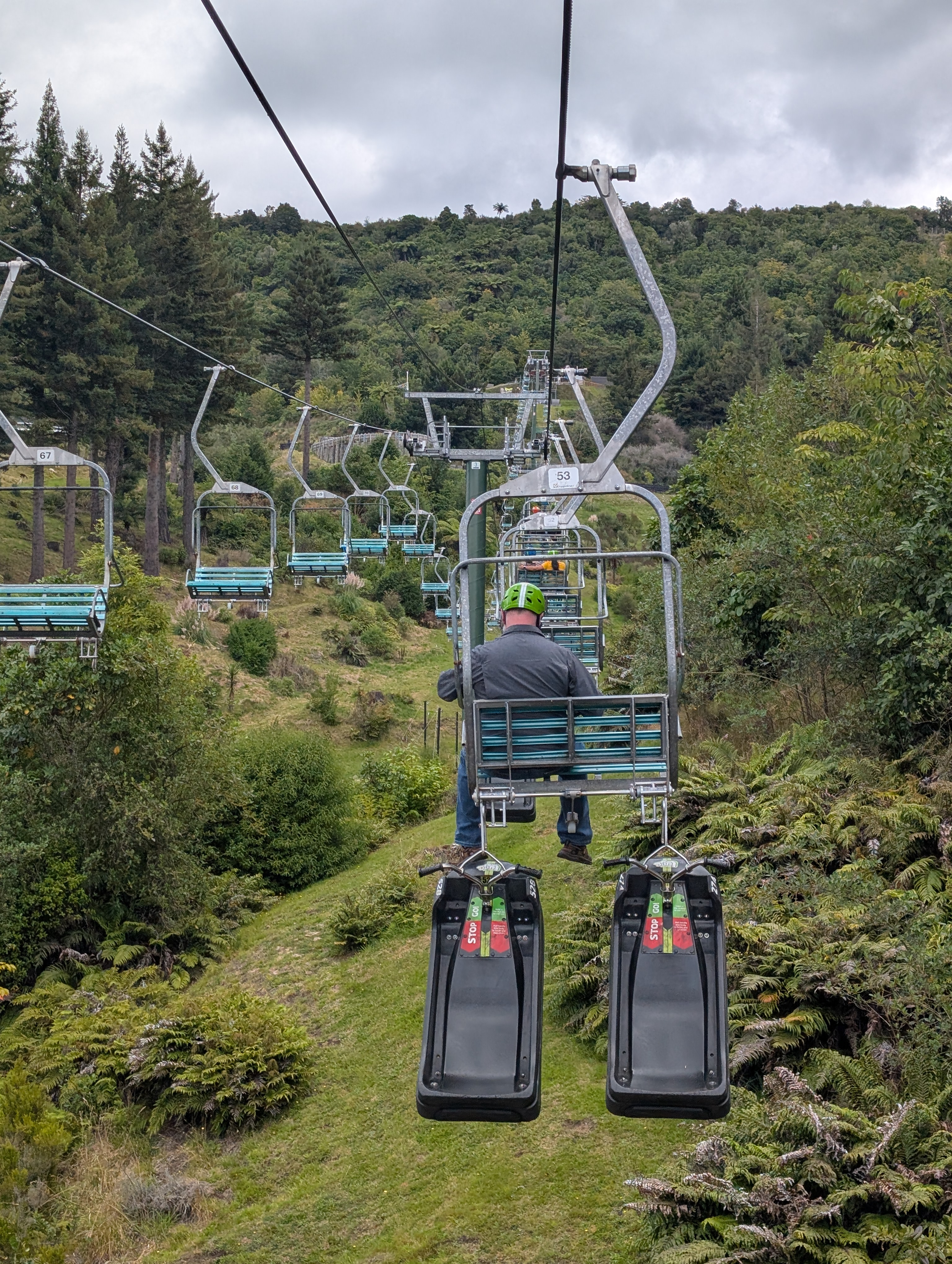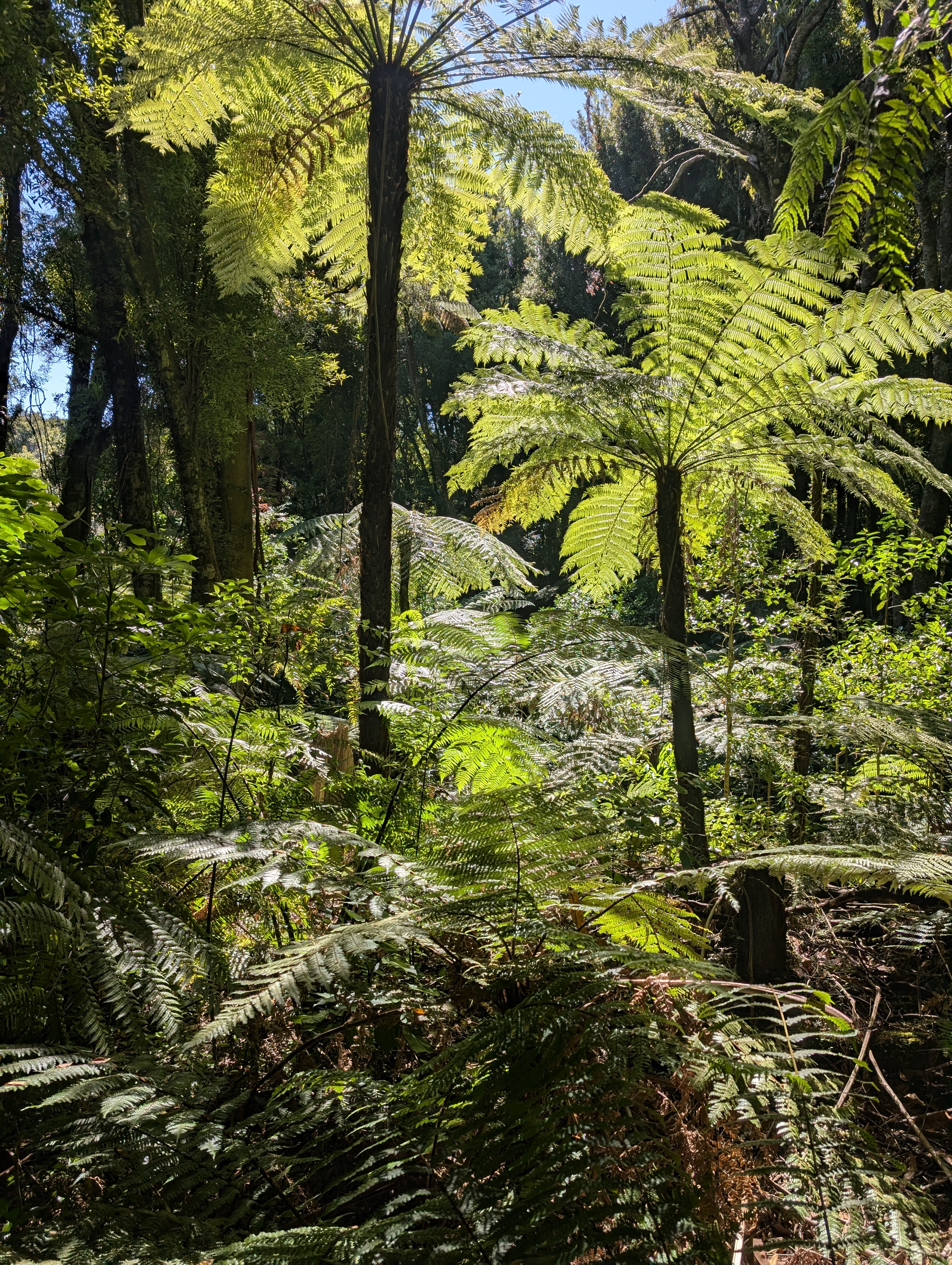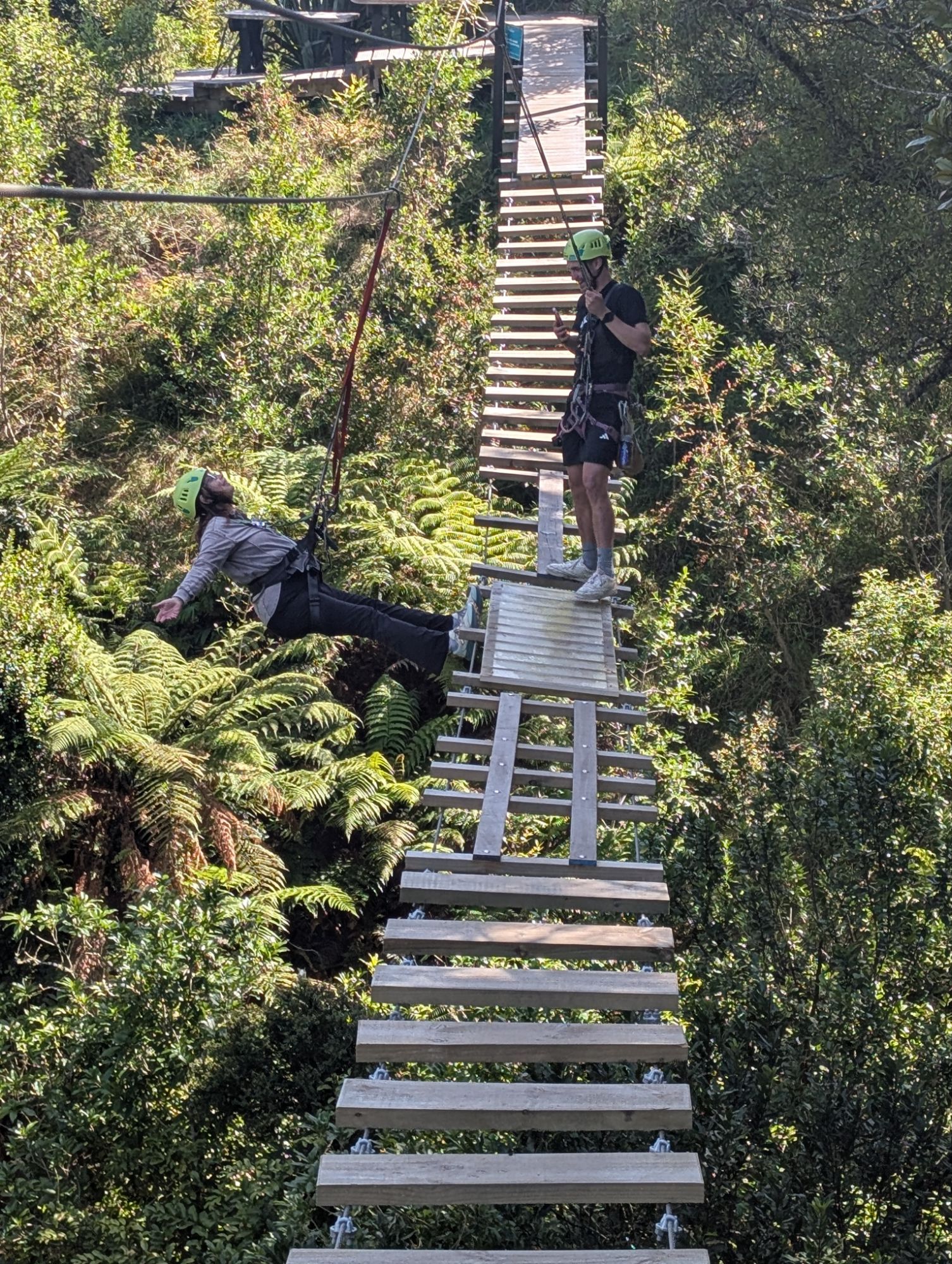 Hold on. How old are you two? We played all day. First, a two hour zip-line adventure through a tropical forest. We had two guides all to ourselves learning about the history of the Māori culture as we walked through the forest. Between learning what plants were edible and the significance of the Silver Fern, we flung ourselves down four separate zip lines with waterfalls below. We also trekked over a very high, but rustic wooden bridge. By the end of the morning, John no longer carried a life long fear of heights. How did that happen? In the afternoon we went separate ways for a bit. Kate went to a lakeside spa for a massage and a soak in mineral pools. John went to Rotorua Skyline to luge down a steep track. The track is reached by riding a gondola up and go-carting down. Then back up again. In the evening we dined at home. Right before bed, the sky cleared and the stars showed more constellations. Tuesday morning, on the way out of town, we stopped at a local secret wellspring, for a walk among the 100 year redwoods. This forest was planted after WWI as a memorial to those lost. It’s extraordinary to see our California Redwoods growing tall among tropical palms.