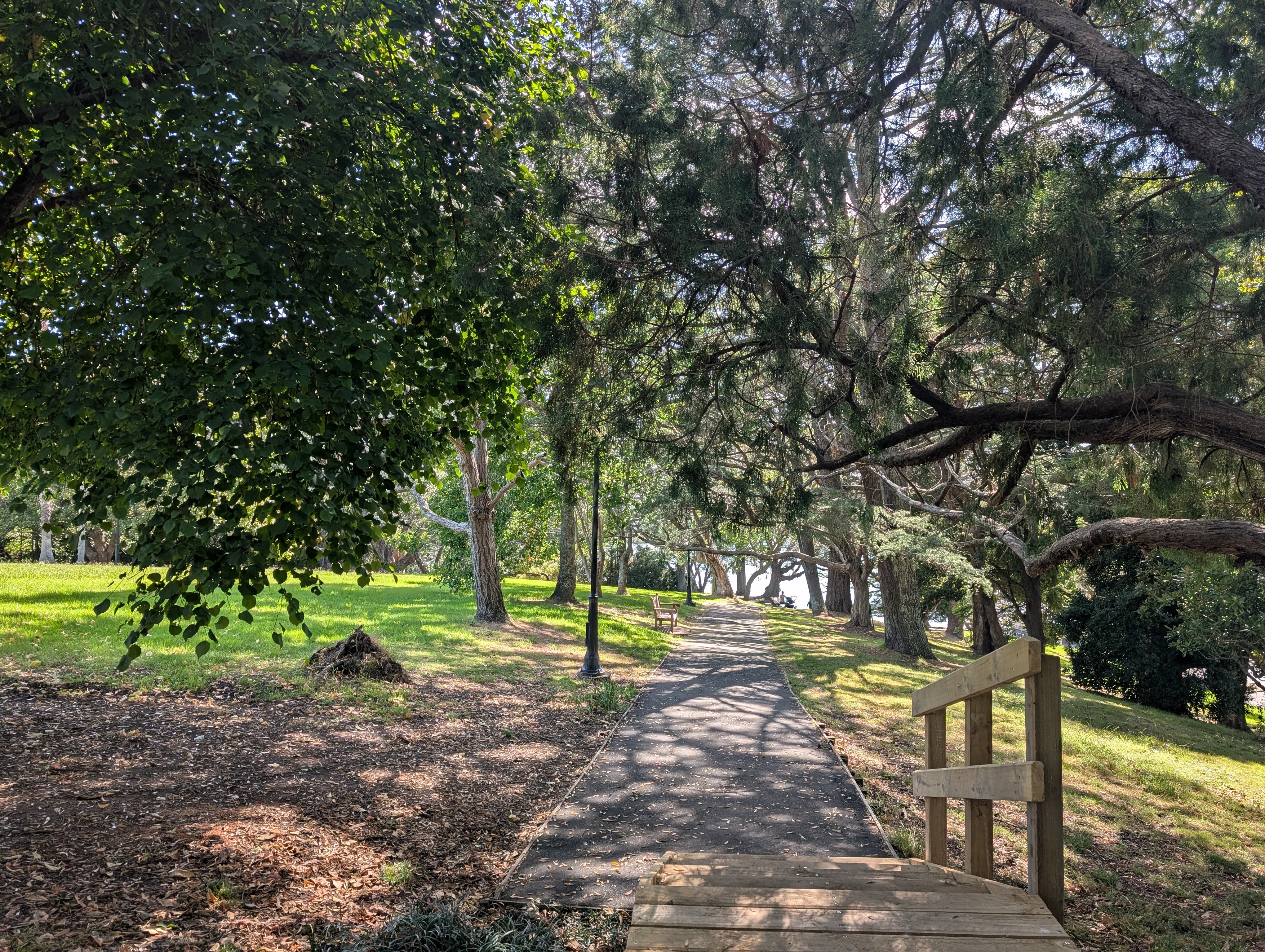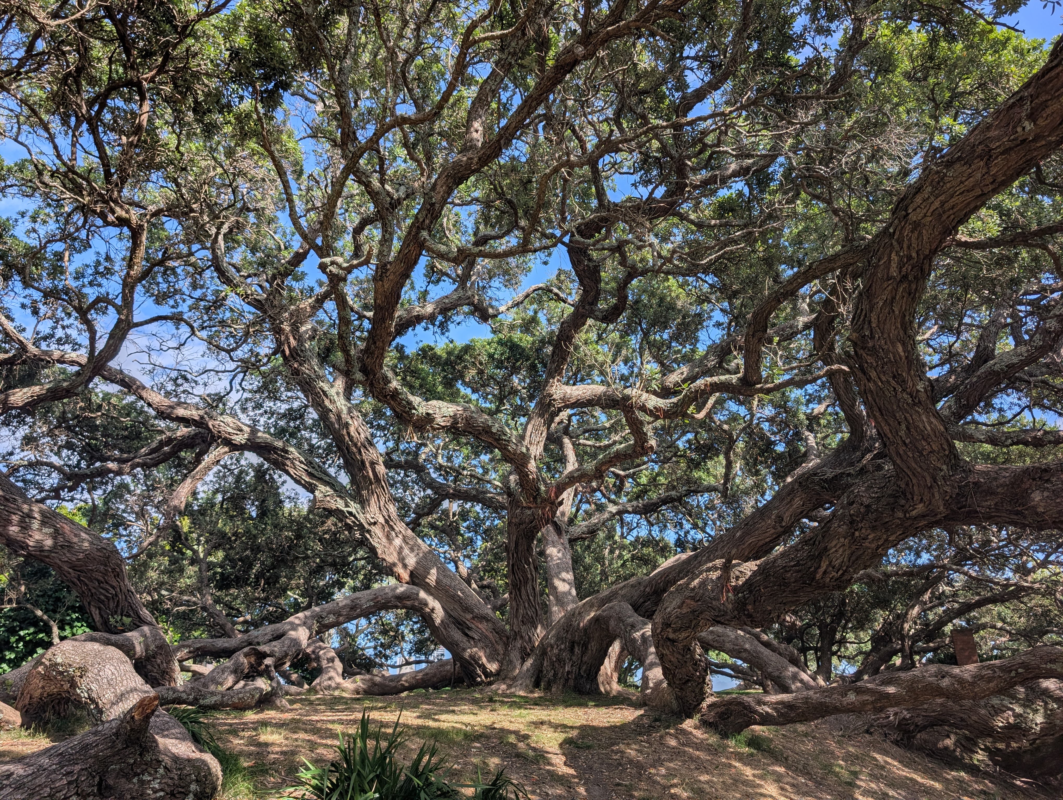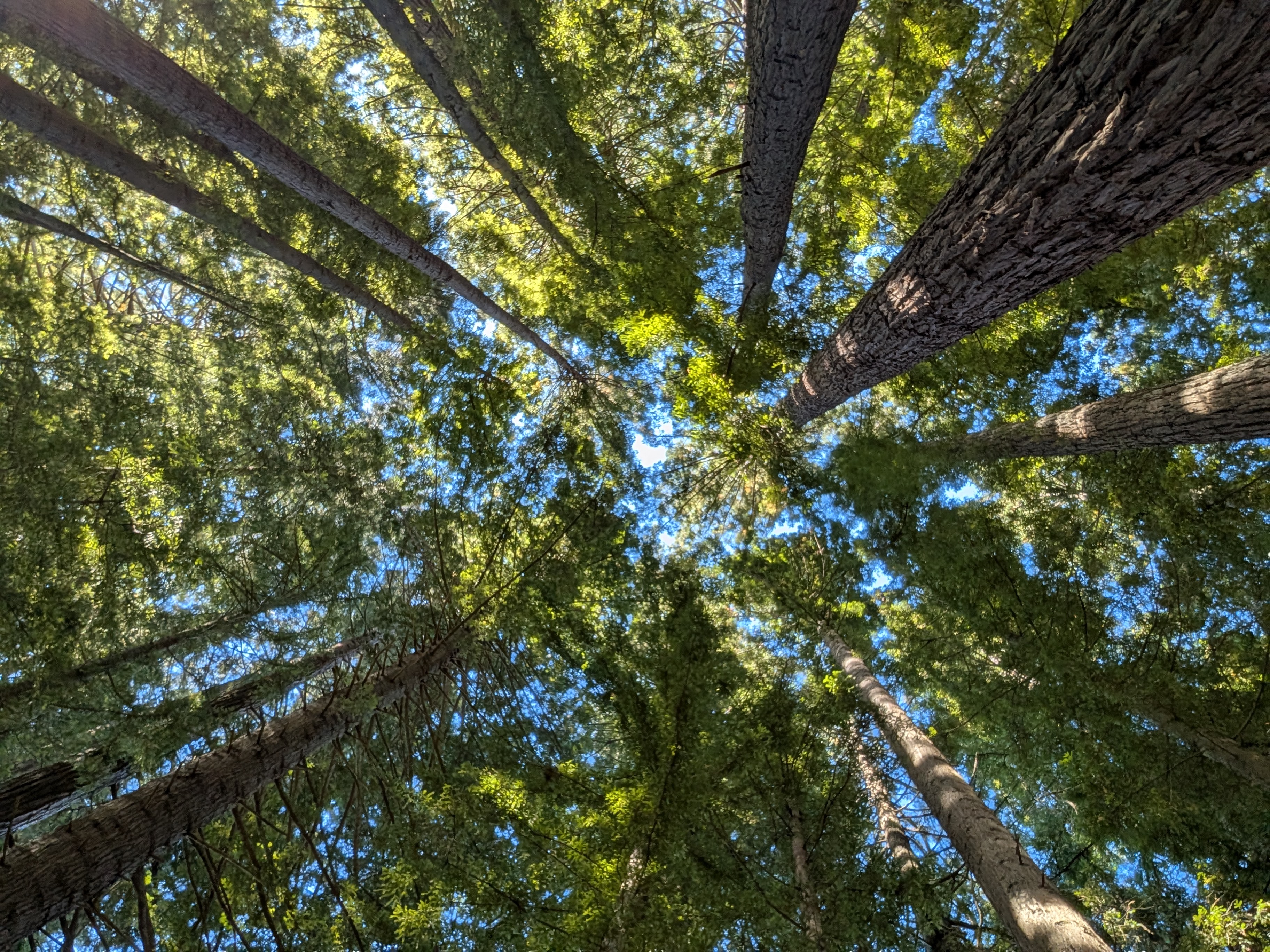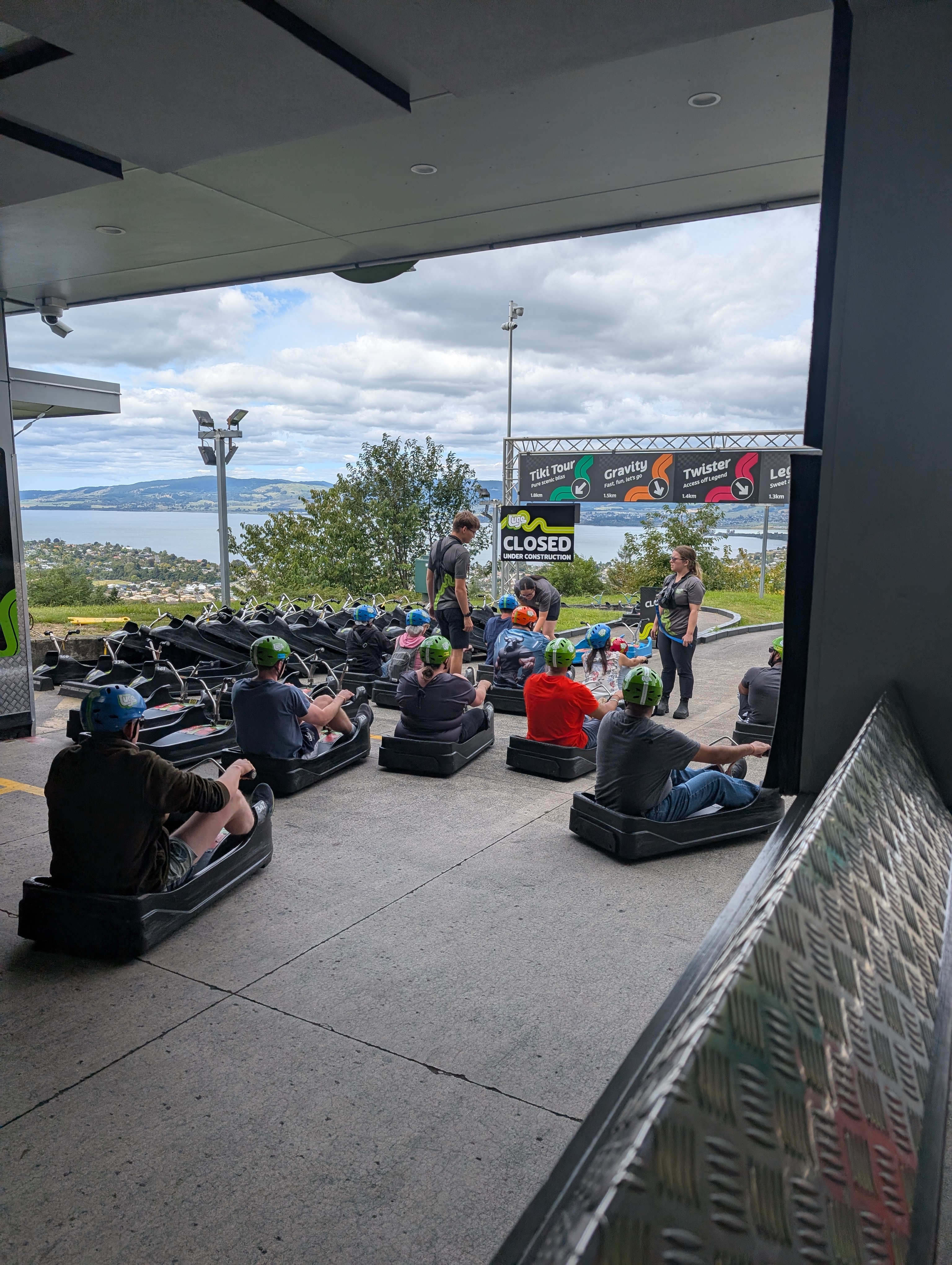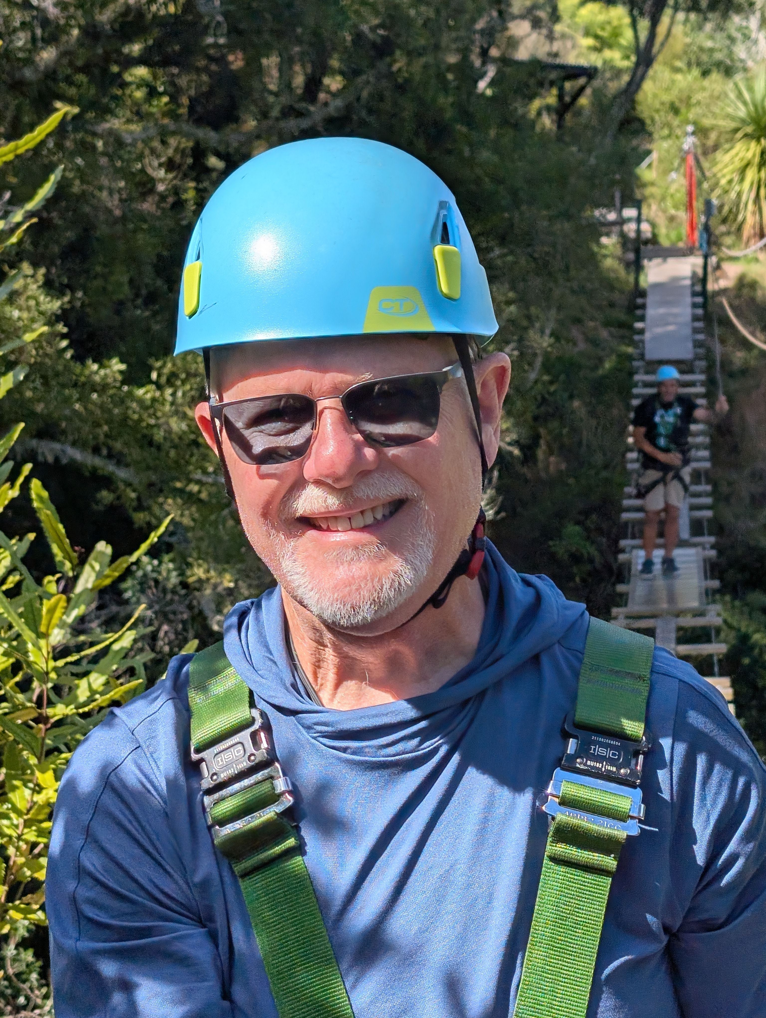 Hold on. How old are you two? We played all day. First, a two hour zip-line adventure through a tropical forest. We had two guides all to ourselves learning about the history of the Māori culture as we walked through the forest. Between learning what plants were edible and the significance of the Silver Fern, we flung ourselves down four separate zip lines with waterfalls below. We also trekked over a very high, but rustic wooden bridge. By the end of the morning, John no longer carried a life long fear of heights. How did that happen? In the afternoon we went separate ways for a bit. Kate went to a lakeside spa for a massage and a soak in mineral pools. John went to Rotorua Skyline to luge down a steep track. The track is reached by riding a gondola up and go-carting down. Then back up again. In the evening we dined at home. Right before bed, the sky cleared and the stars showed more constellations. Tuesday morning, on the way out of town, we stopped at a local secret wellspring, for a walk among the 100 year redwoods. This forest was planted after WWI as a memorial to those lost. It’s extraordinary to see our California Redwoods growing tall among tropical palms.