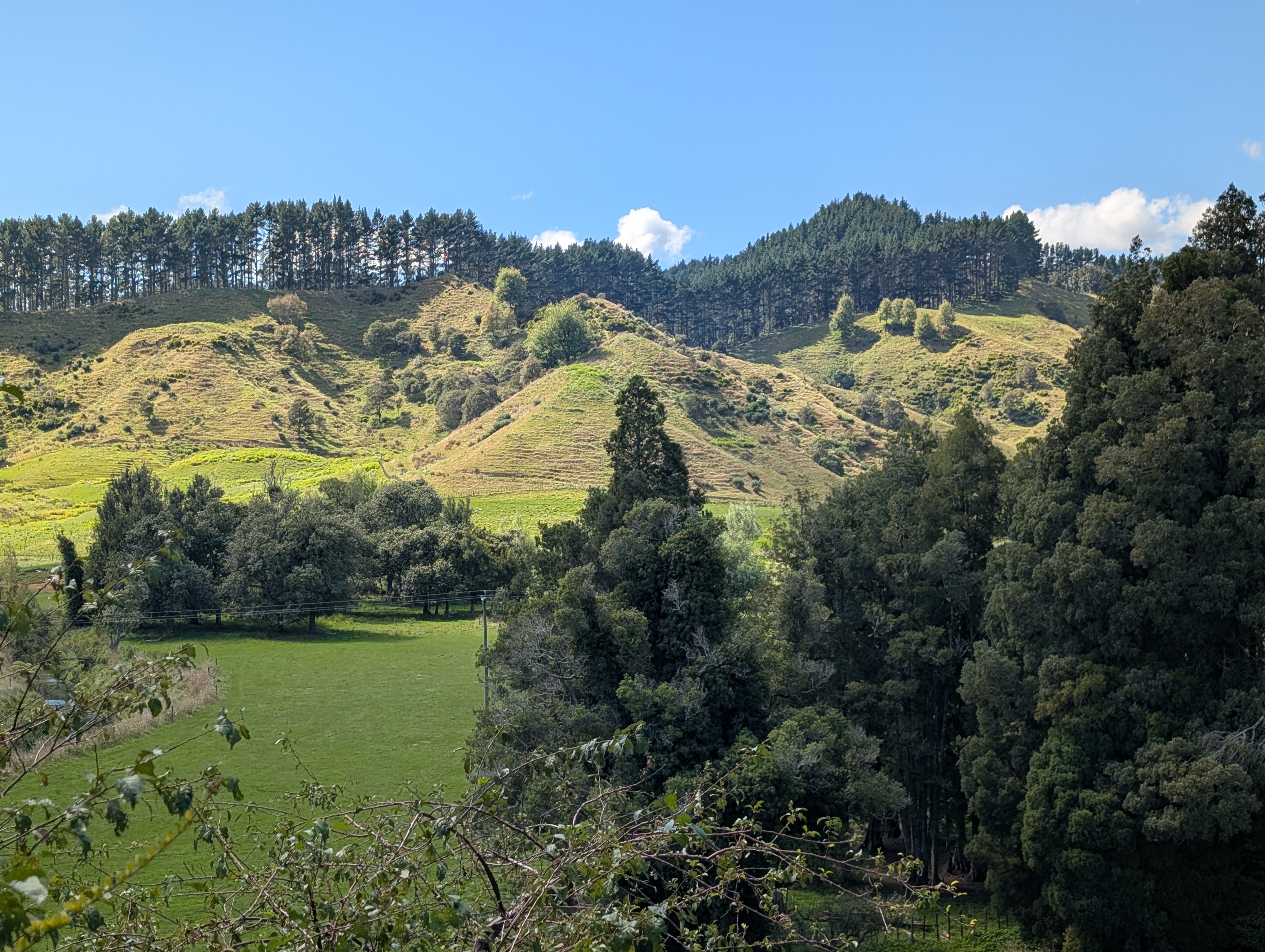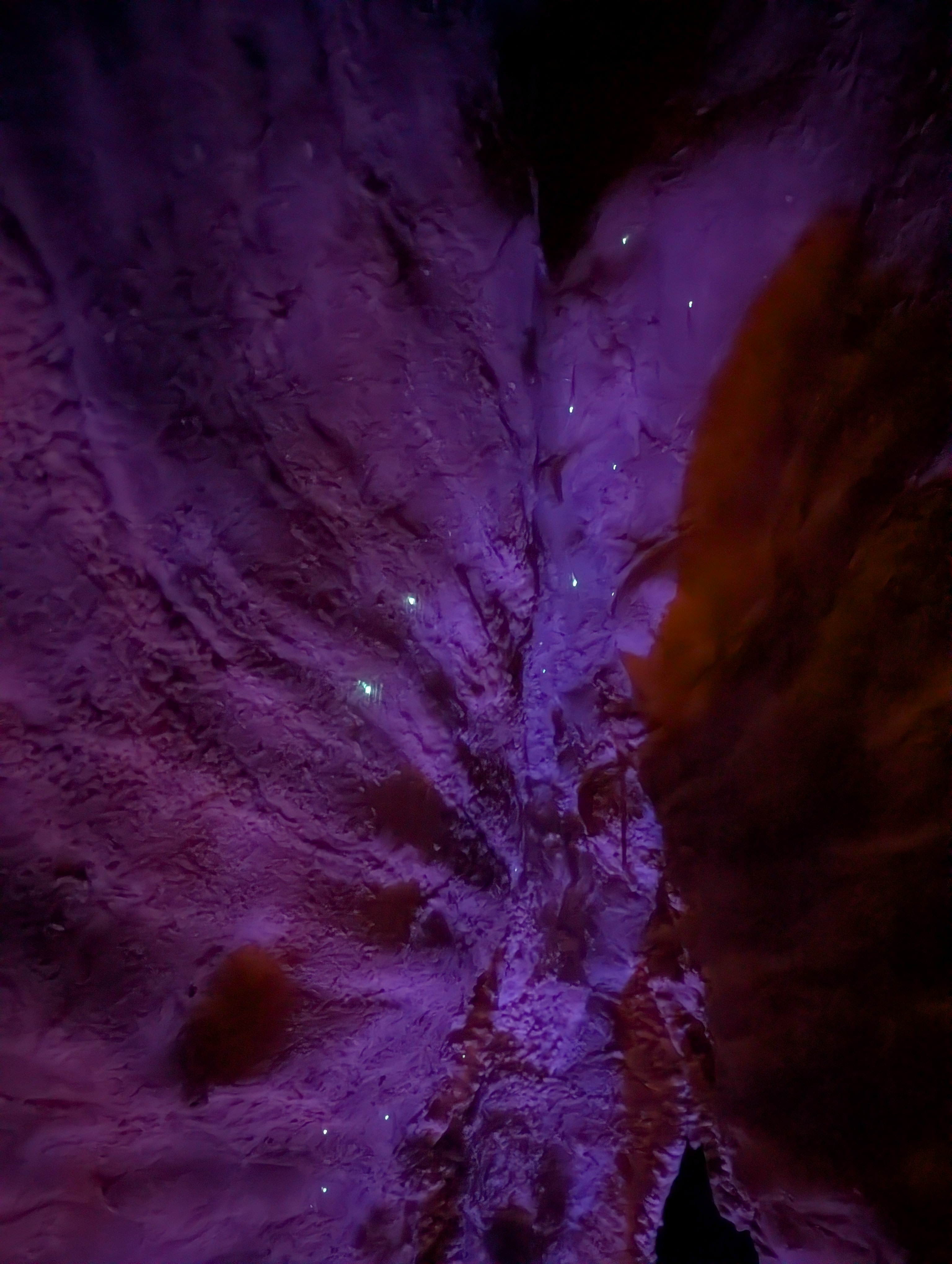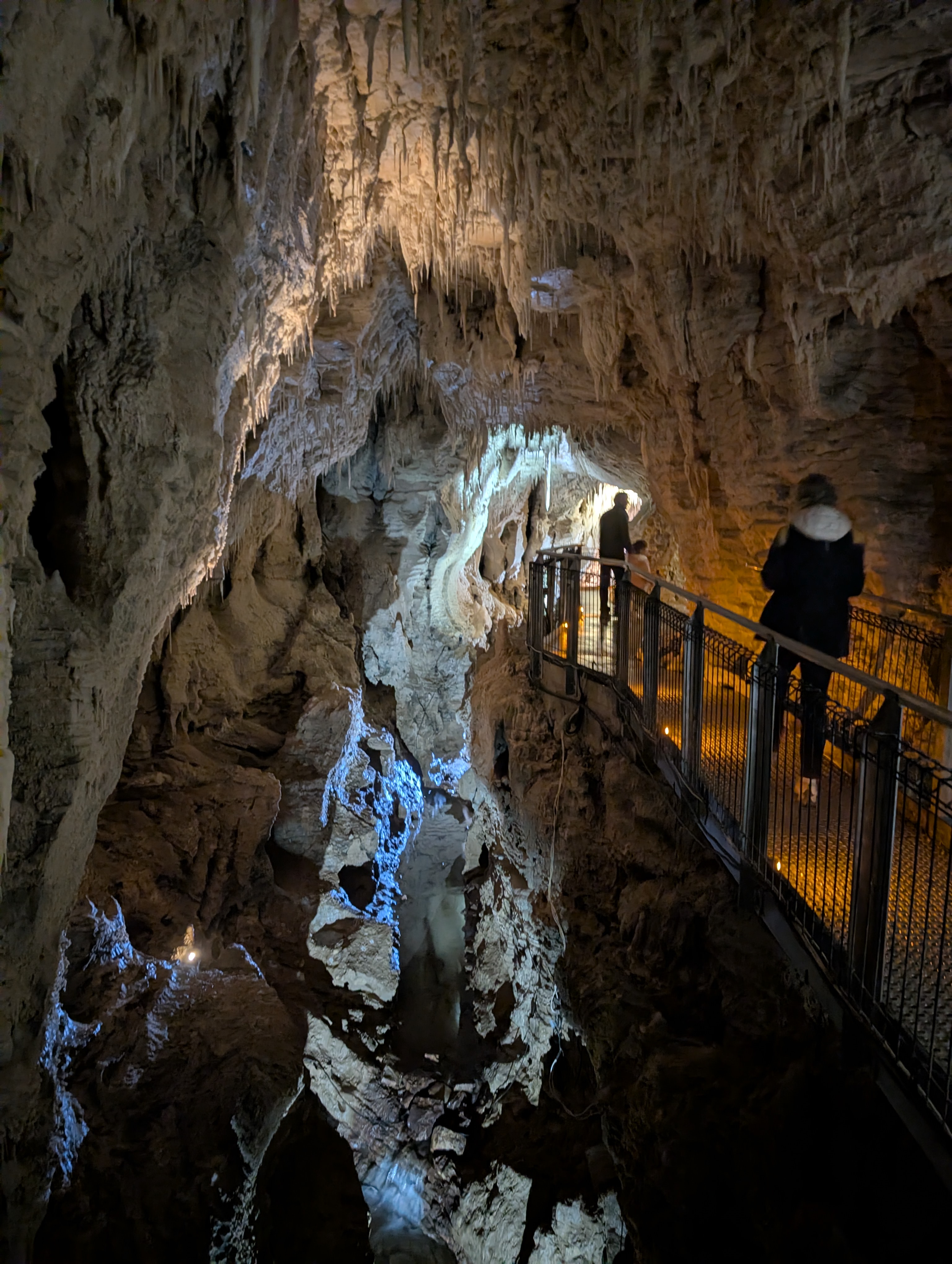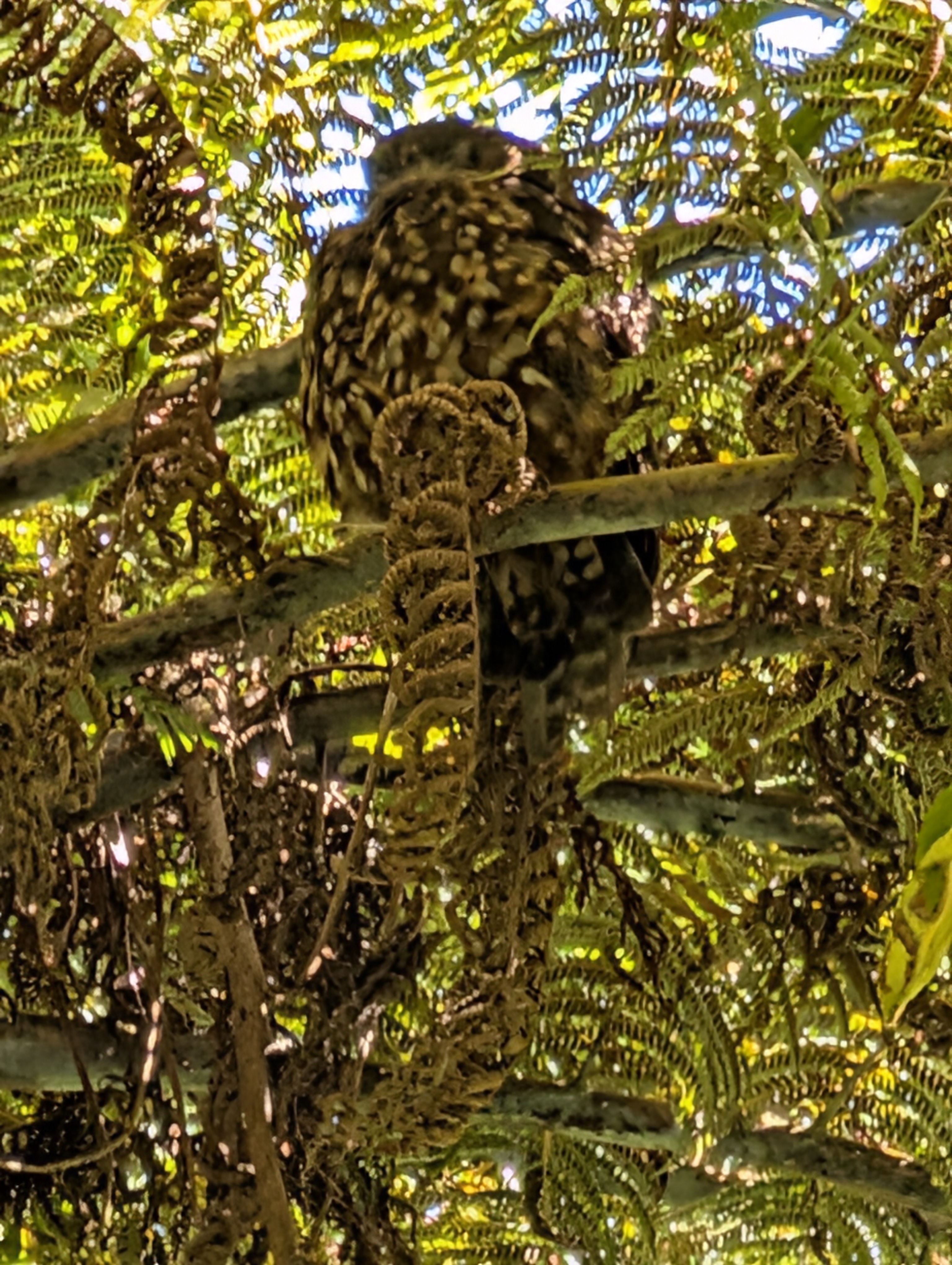 We’ve had a great two days in Waitomo. Our AirBnb was a home on a 700-acre working ranch with great views of pastures and countryside. Last night we met Fred and Barbara from England at dinner and talked for hours. Today we visited the caves and it was a glorious two hour tour, descending 150 meters underground on some truly astounding infrastructure. Waitomos’ claim to fame is its caves and magical glow worms. Depending on your level of strength and curiosity, you can raft the underground rivers or repel 300 meters down and hike the river bottom. About those glow worms: They are actually maggots. They glow to attract their prey, insects that find their way into the caves via a subterranean river. The insects are drawn to the starlike glimmer of the worms/maggots. They think the light is leading them out of the cave when they are actually being led to dinner. Nature, once again, teaches us about the dangerous draw of shiny things. In the afternoon we opted to drive to a Nature Sanctuary to view a protected site for birds. Lots of exotic birdsong, but few sightings in the late afternoon and dense forest. Oh, one sighting. An endangered owl. Quite a find for any birder. For Kate, it was dumb luck and a really good camera.