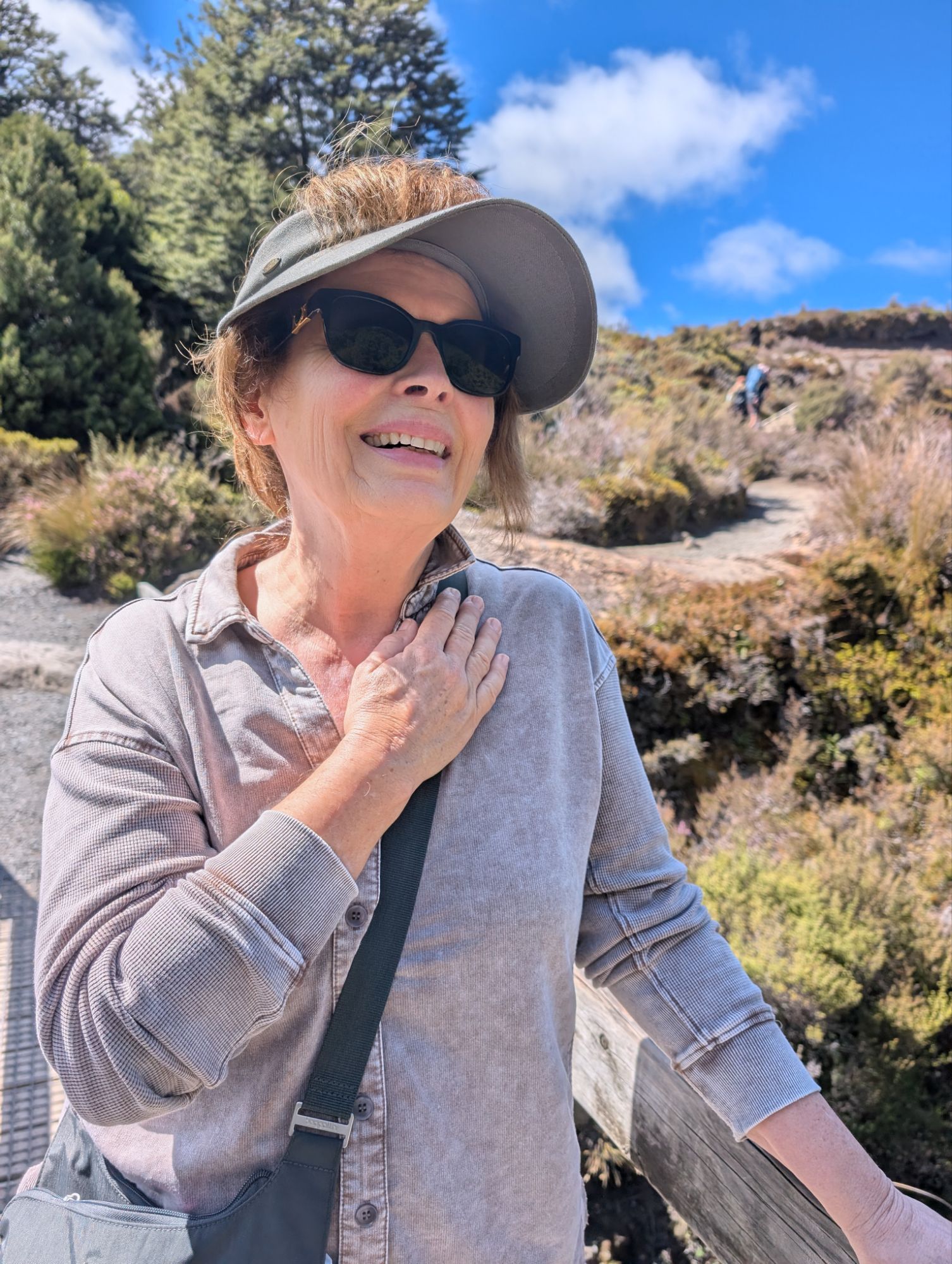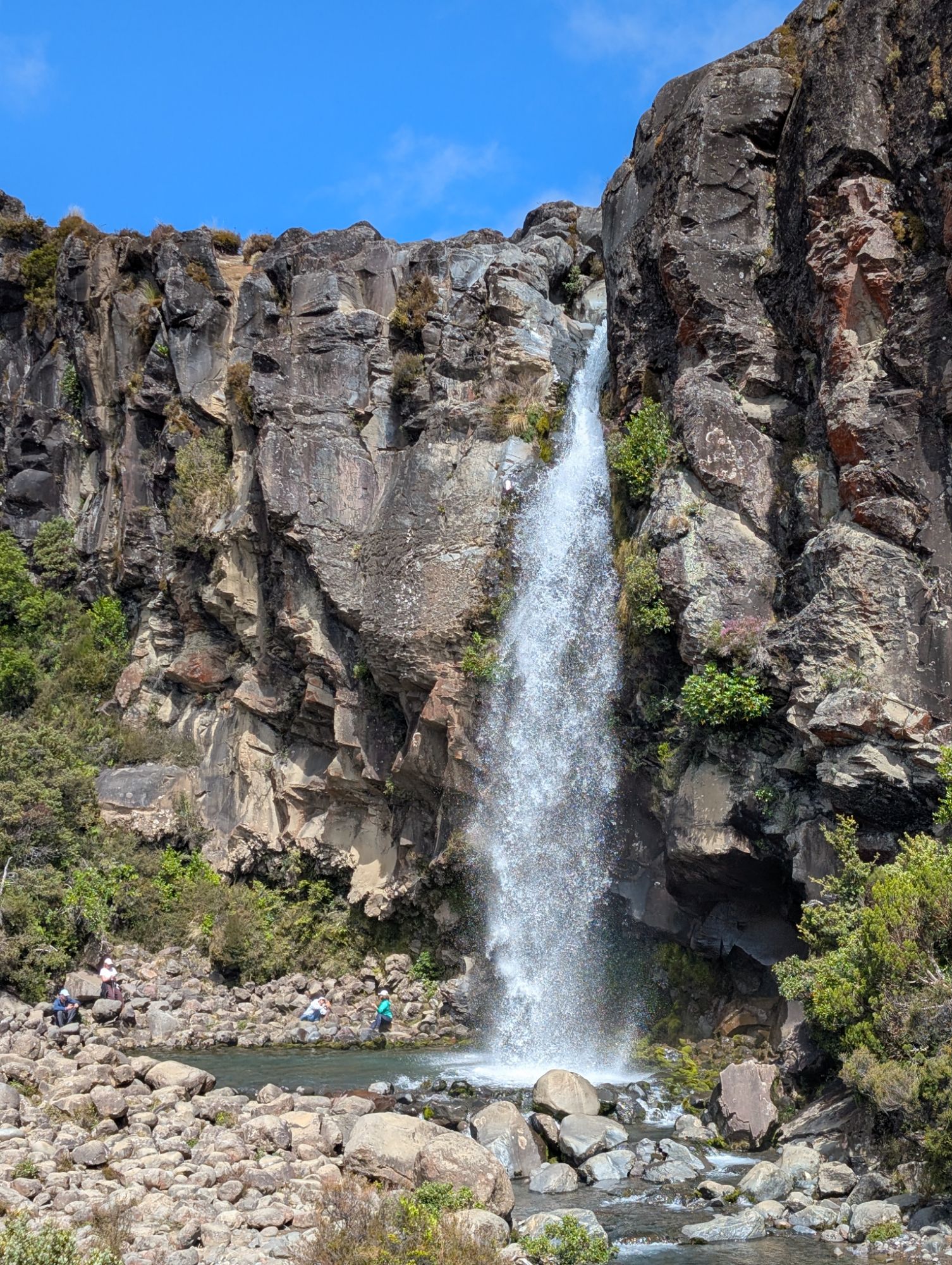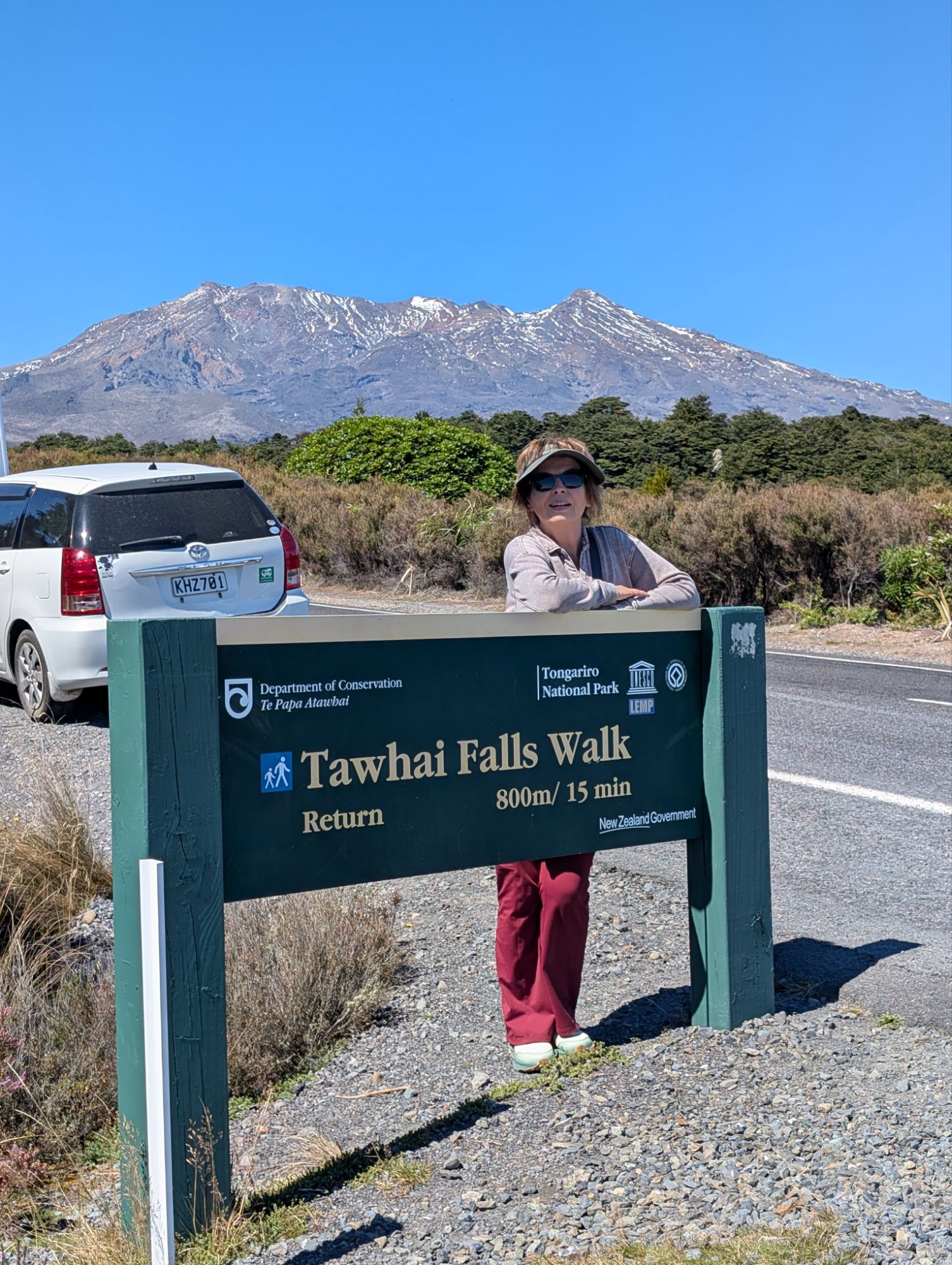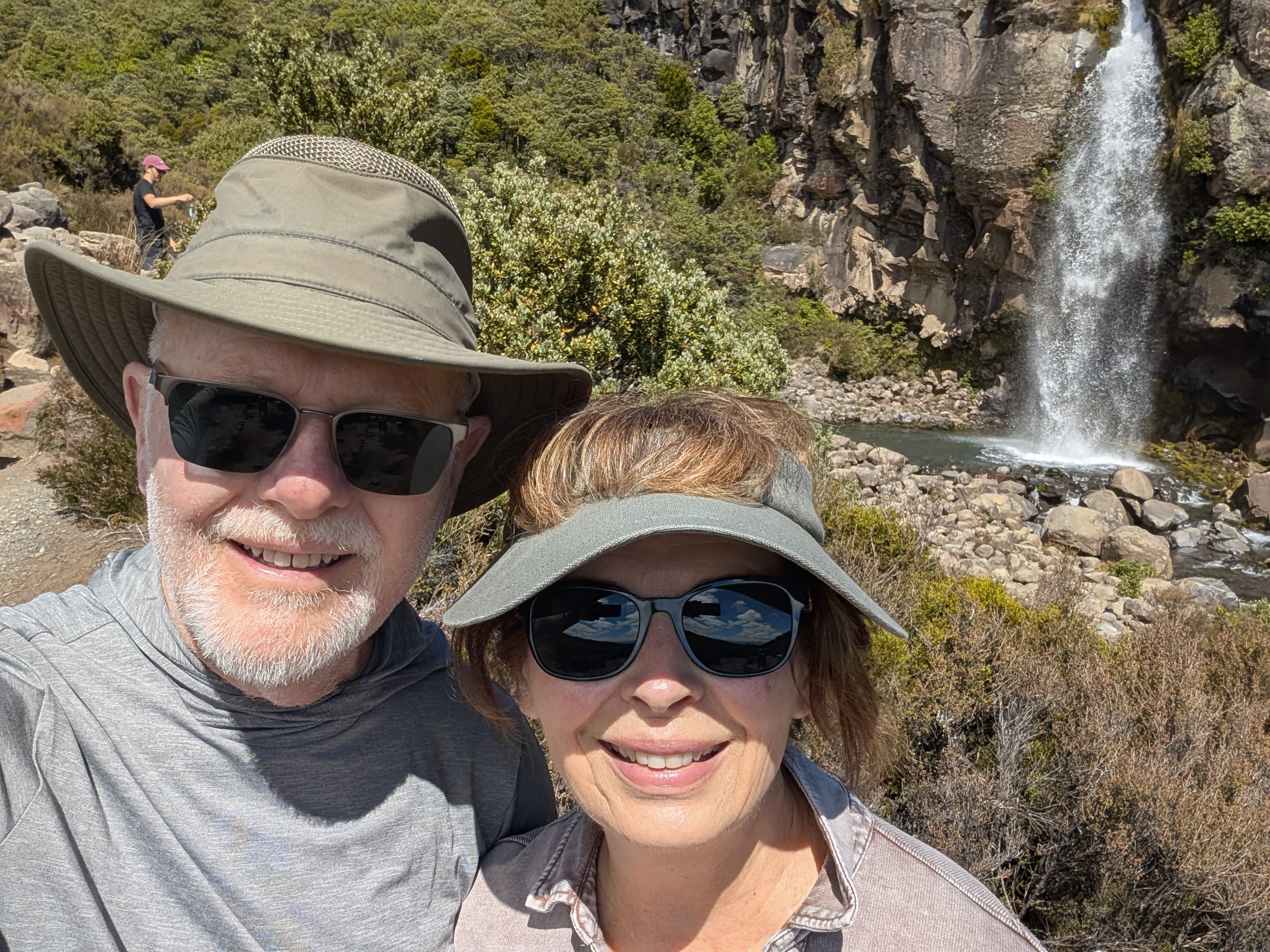 We’ve spent two days in Ohakune, a small town a bit off the usual tourist track. Kate has been fighting a cold but was quite the trooper today, getting out and hiking for 2.5 hours. After a 45 minute drive from town we walked the 2 hour loop to Taranaki Falls, the most popular hike in the Tongariro National Park. The volcanoes have not been active in several years. It was our first real hike, and tonight we are dragging! This was the easy hike! Regardless, this post will be brief as we are gassed. Tomorrow we head for Rotorura, a very popular site for tourists with many attractions including the lake, bicycling, speed boats, zip lines, etc. Kate is thinking spas. From now on, she will be leaving her hiking poles in the car, always at the ready.