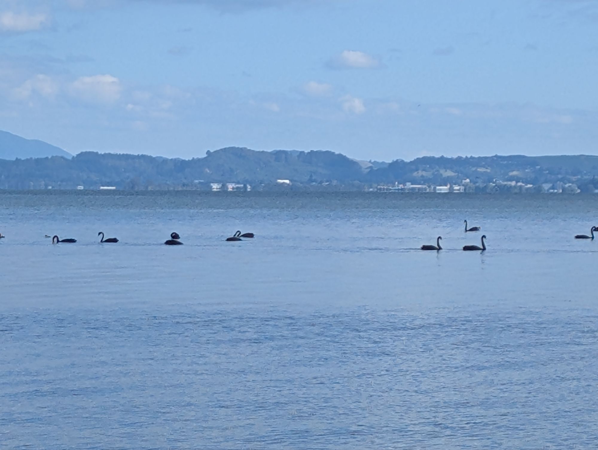 We arrived in Rotorua late yesterday afternoon, and oh my, what a wonderful spot we landed in! Our AirBnb is right on the waterfront of Lake Rotorua, in a beautifully appointed home, with its own private beach. Hundreds of Black swans dot the seashore, all about 30 yards offshore. They sound like a group of children in a distant playground. Even with their song, we are enchanted with the quiet. The place is called “Wytchwood Lake House”. Some of the ladies will recognize a sister as our host. She absolutely is one of the tribe.