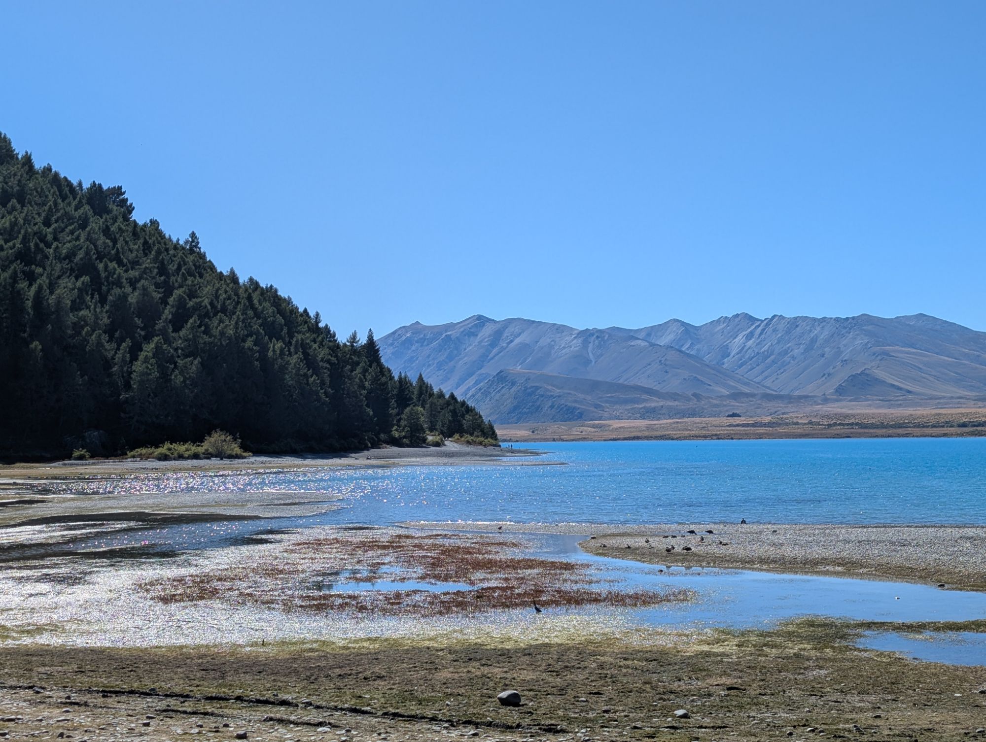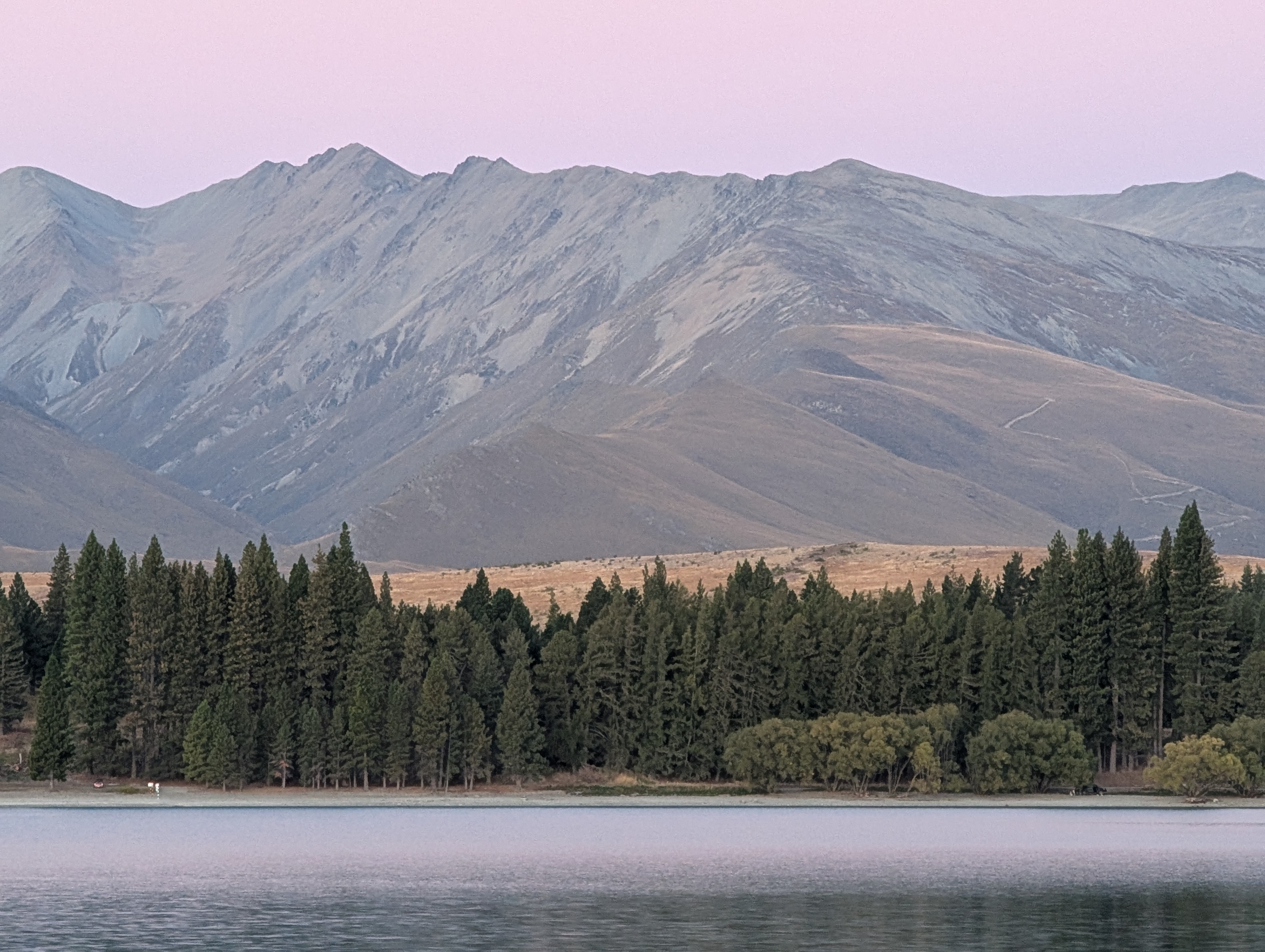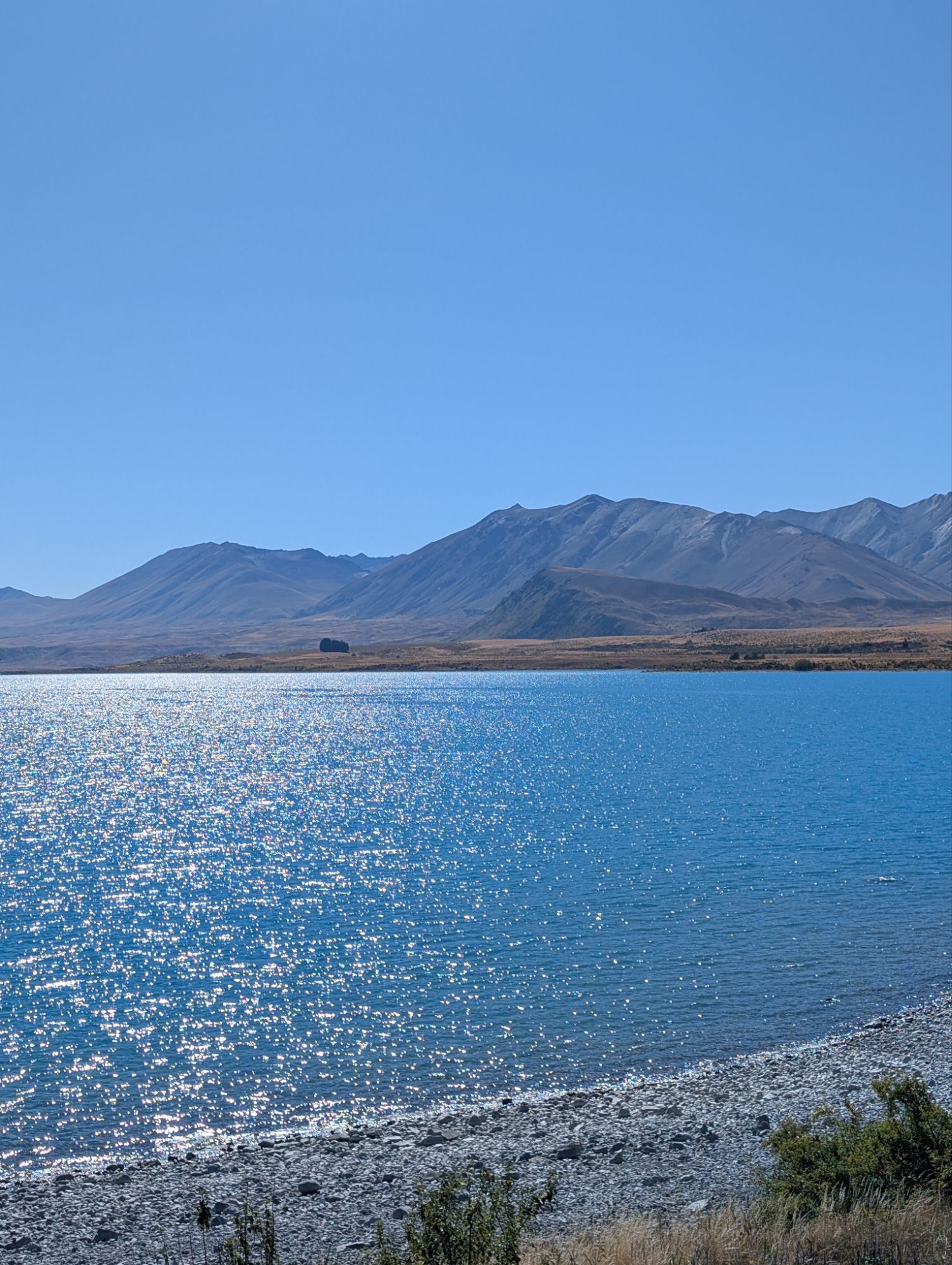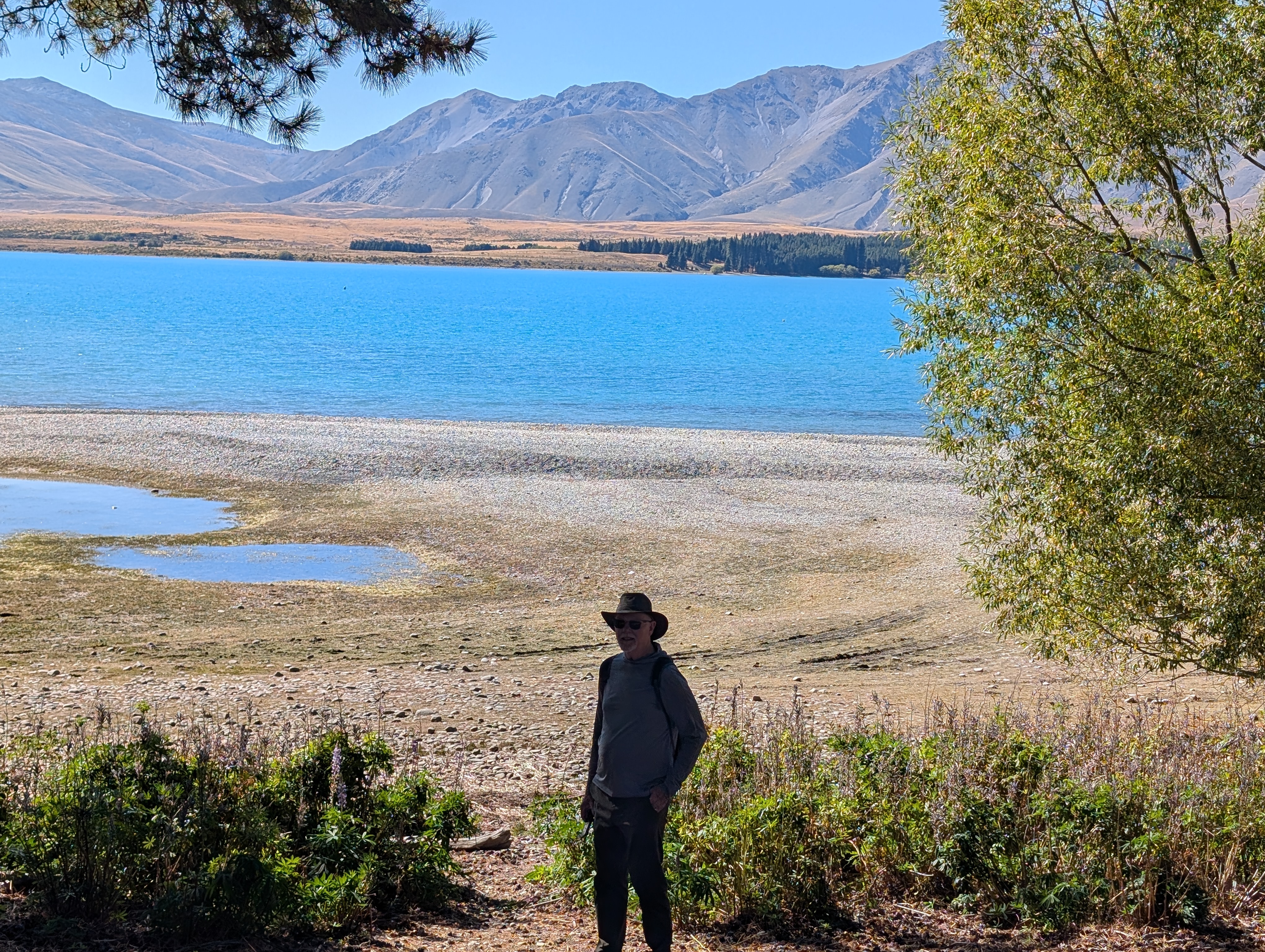 We just spent two nights on Lake Tekapo., a glacial lake fed from Mt. Cook. When we arrived, the lake didn’t look particularly significant. Mid-day, after a long drive, we saw autumn brown mountains and a rock strewn shoreline. After a well-needed rest, we returned to the shore before dinner and discovered what the fuss was all about. The mountains now looked like the efforts of a master plein air painter. The lake glowed as did we. Imagine a place where the sky is protected from human intrusion. There are no lights on the lakeshore to interrupt a clear night’s wonders. That night, we stayed up and went out to watch shooting stars, a bit of Aurora Borealis and far off galaxies. We could see a spiraling galaxy without a telescope. John tells me that if you click on the star photos, you may see a bit of what we did. Adding to our experience were the chatterings of Chinese tourists. Given how much they love their technology, I suspect their banter involved how one can best capture the Milky Way. The next morning after a late “lie in”, as they say here, we walked along the lake, glacial blue matching the clear sky. Incredible. My journal prompt this morning asked how I felt about traveling to, and possibly inhabiting, other planets. This planet of our is a rare creation. Why would we want to go elsewhere? Then again, last night we talked to some French tourists who were struggling to find their way back to France. Traveling through the Middle East, which they did when they came to New Zealand is no longer an option. As we luxuriate in such natural splendor, humans are damaging this divine gift.