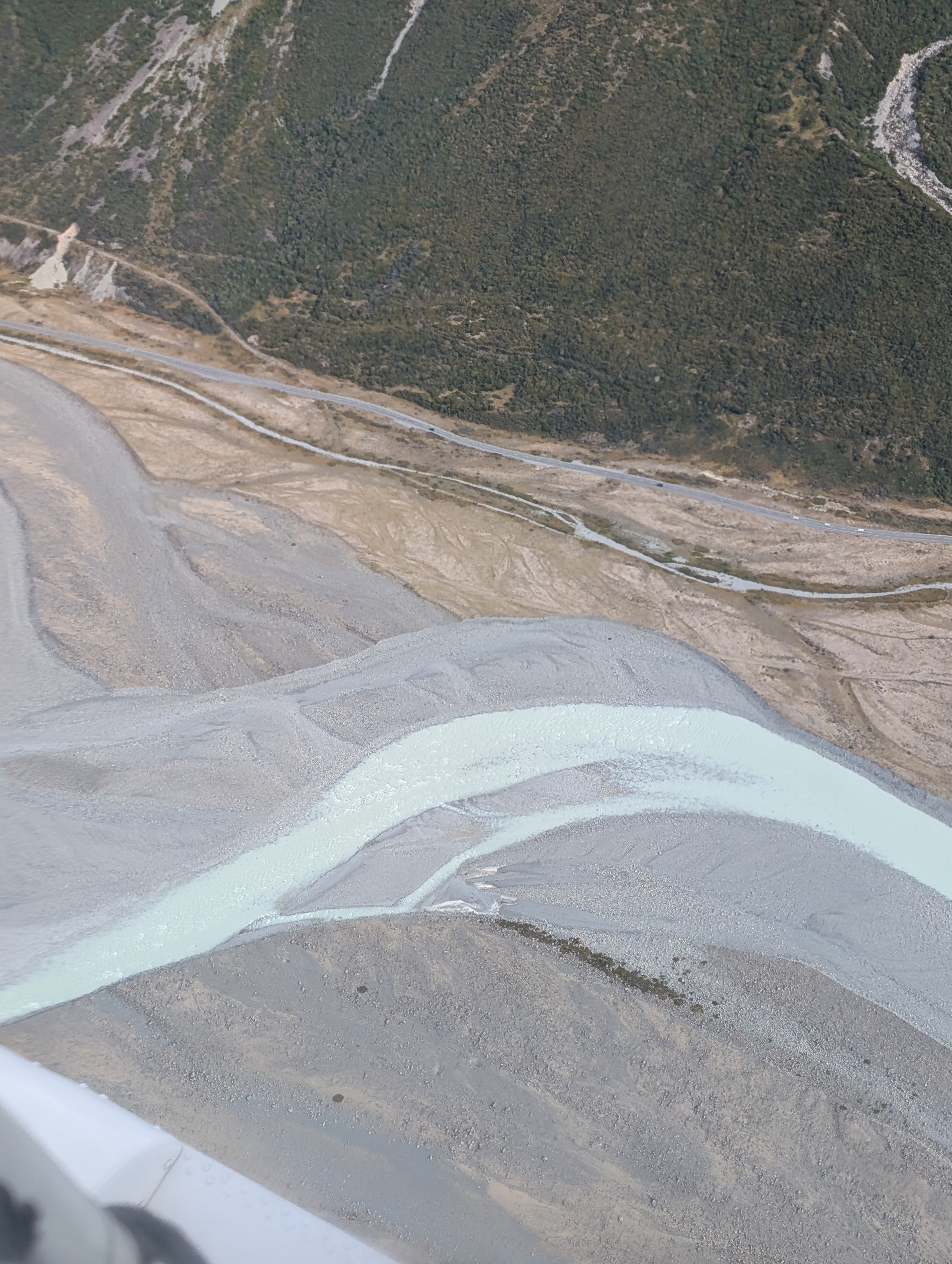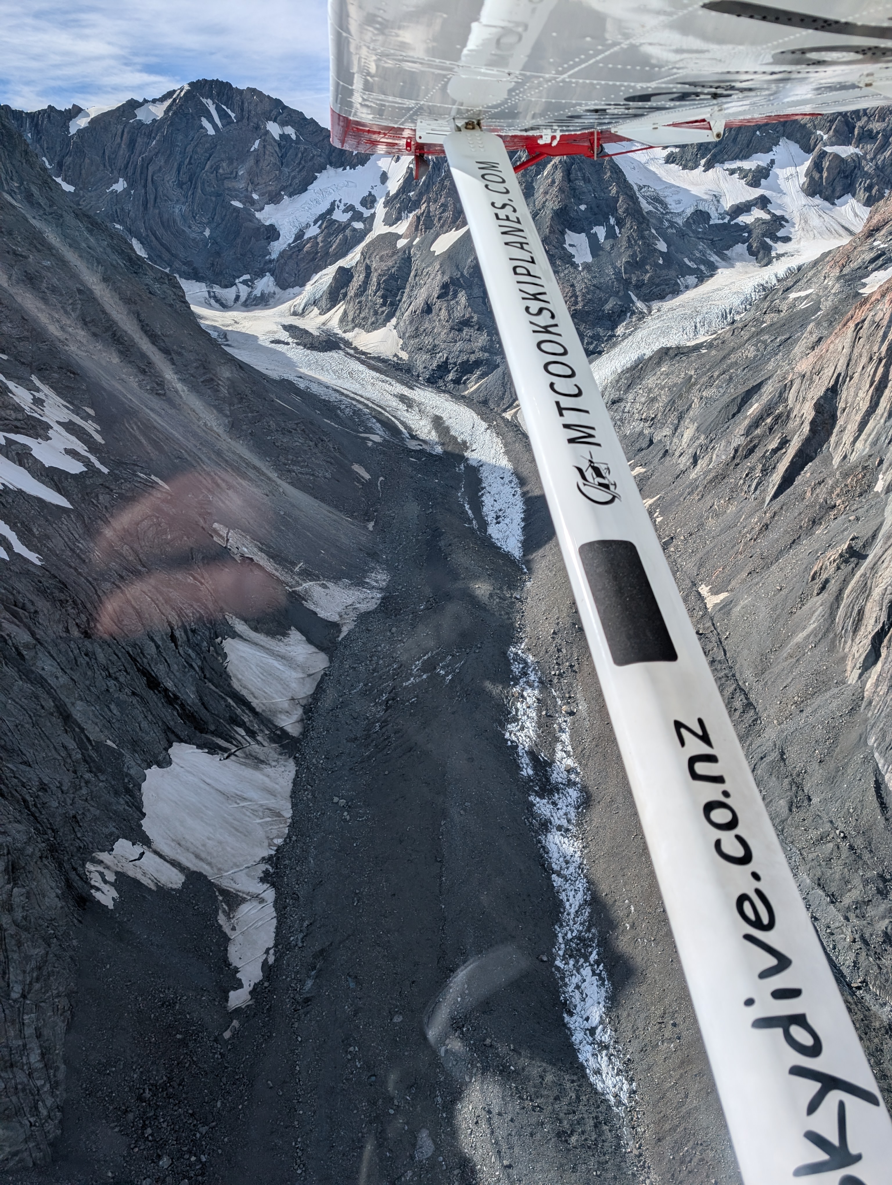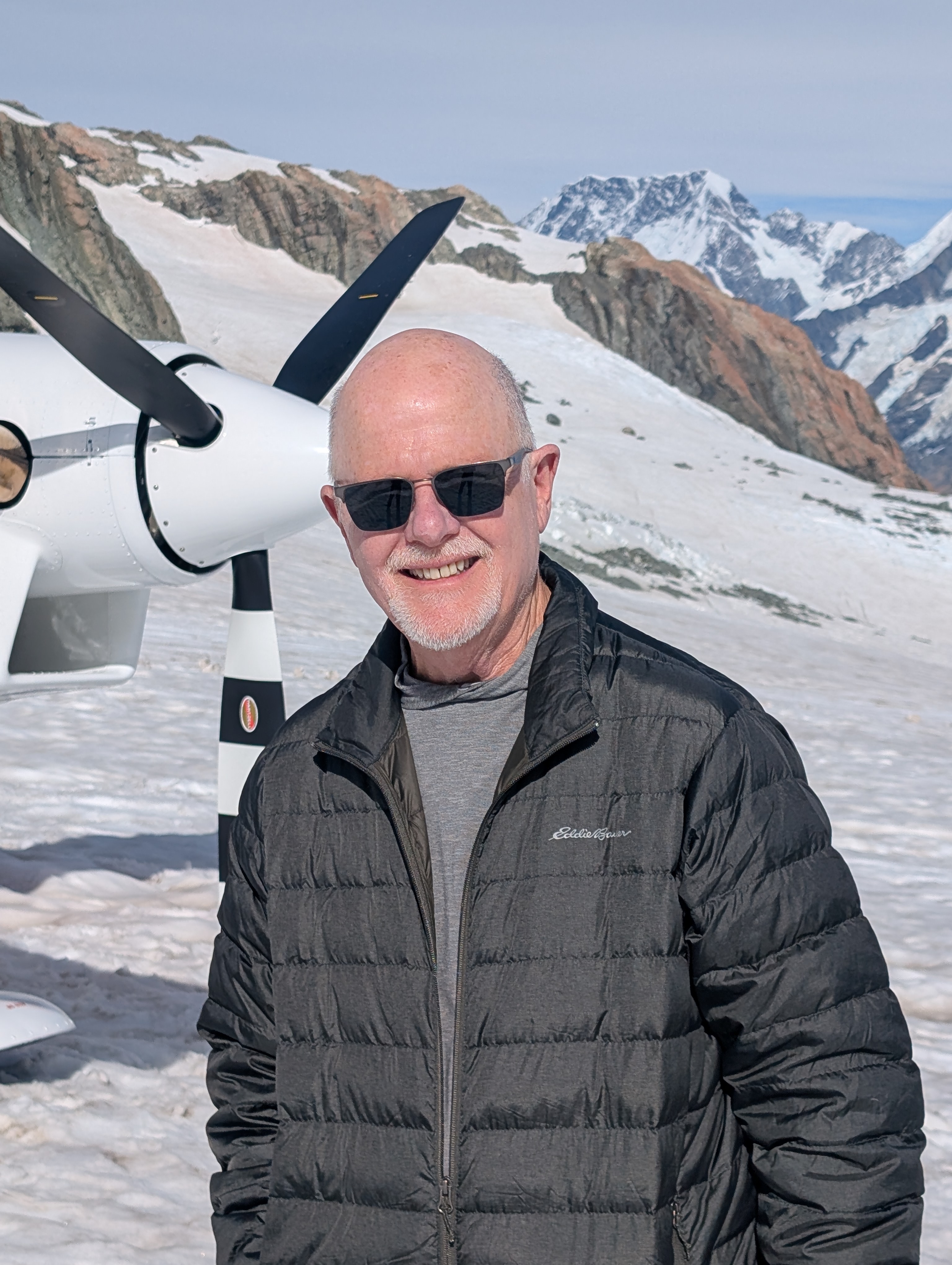 Today we drove to Mt Cook, flew in an 8-seat plane and landed on the Franz Joseph glacier. John sat in the cockpit beside the pilot. Once again, the guy who used to be afraid to cross a bridge or look over the Grand Canyon cannot get enough of heights. Meanwhile, Kate is in the second row, one-cheeked again the door. The first serious bump had her clutching the stranger on her left. He was a generous fellow as his wife was screwing holes in his knee on his right side. Did Kate take any photos? Well, she might have if she had had her eyes open. Rather, she was praying to all that is holy to get her the hell onto the ground. She did manage to take a photo of our rather young American pilot. He assured her with some sort of analogy involving a fork and jello, that the turbulence was nothing to worry about. She had to have faith, because she was on a glacier. It is difficult to fathom how big these mountains actually are. The pilot pointed out the crevasses below. They are much deeper than they look. Some were between 150 to 3000 feet deep. So, if one were to fall in? That is that. The glacial water was an otherworldly color: not green, not blue. Magical. Really, all in all, an extraordinary day!