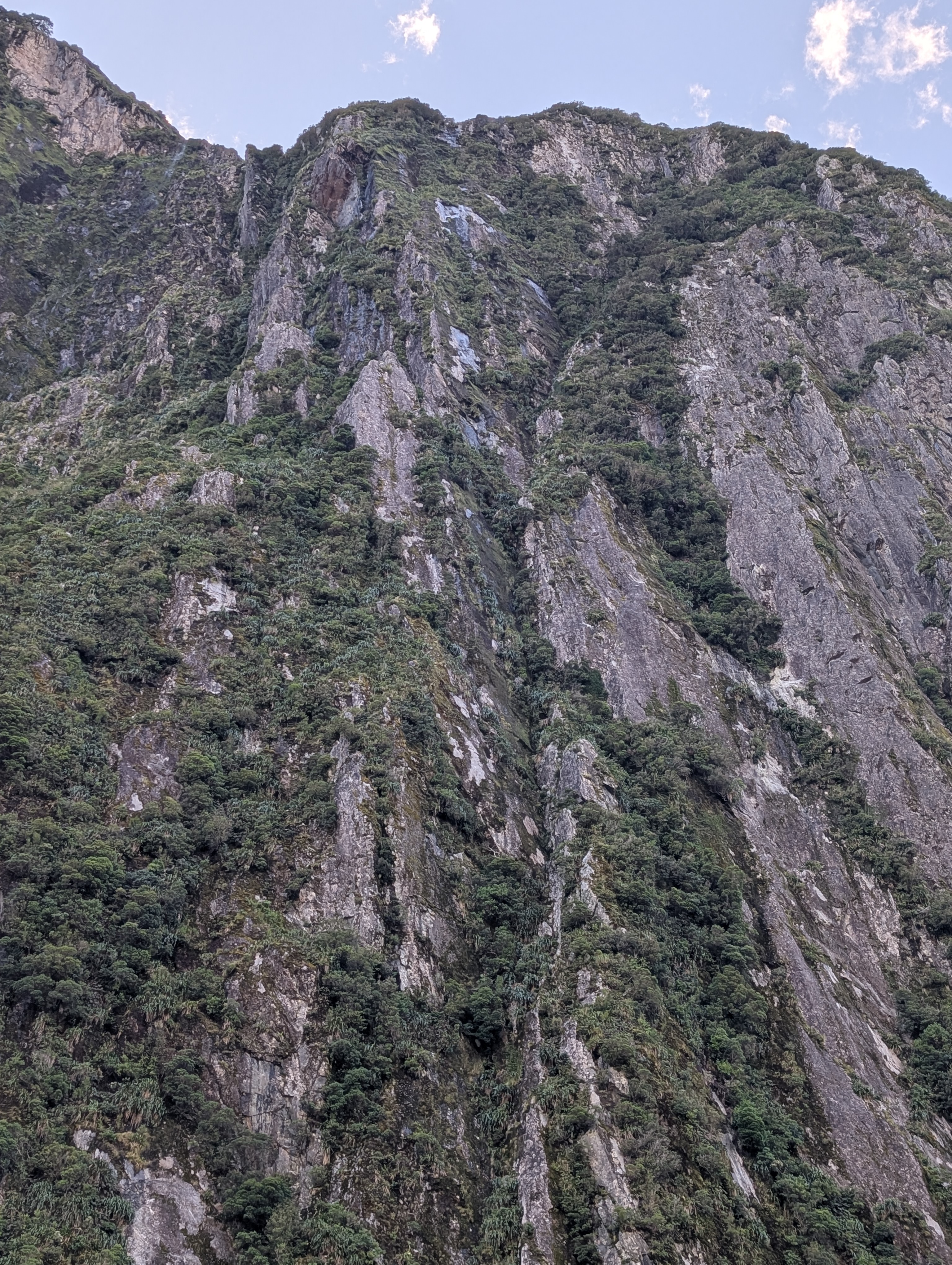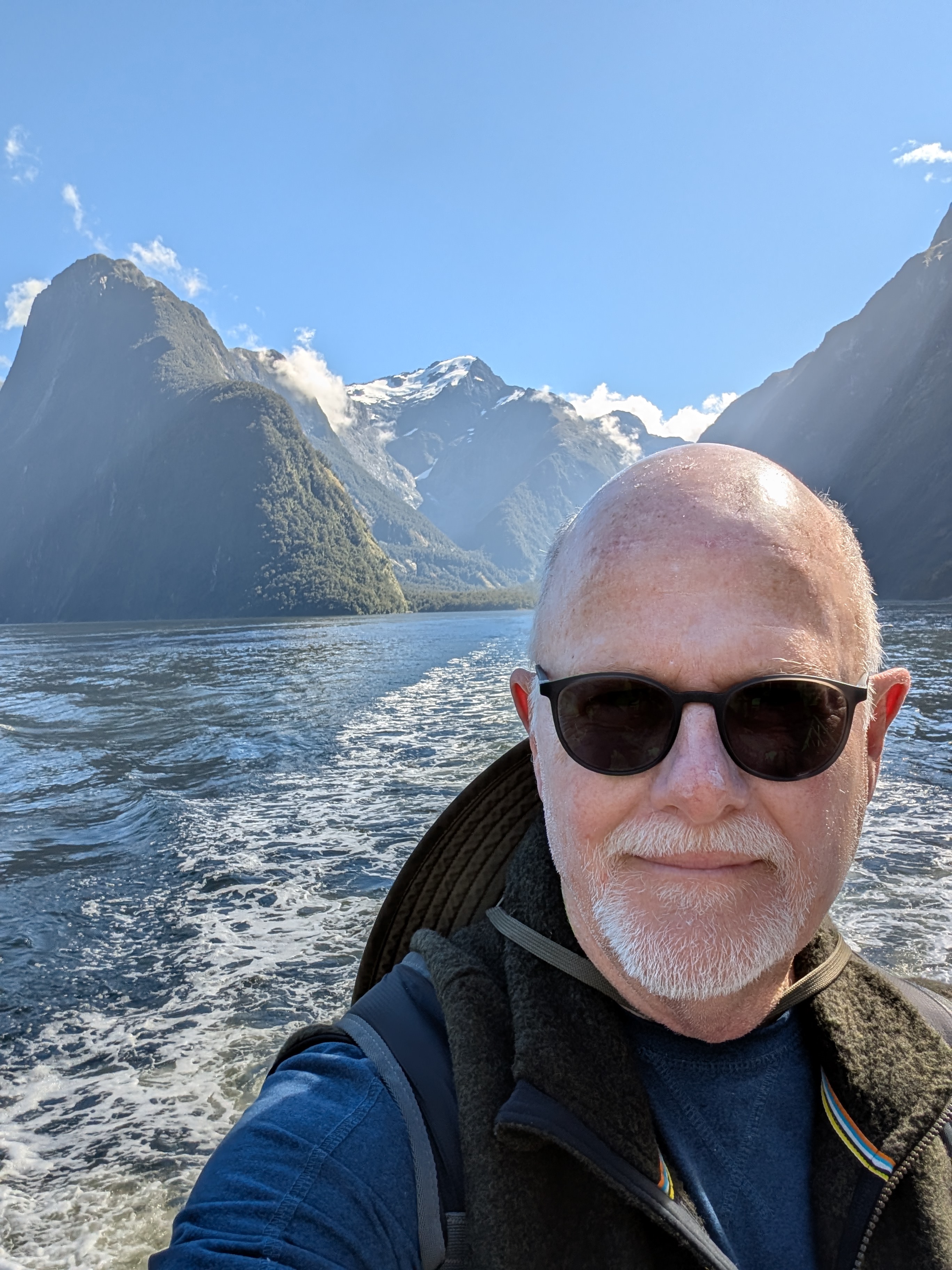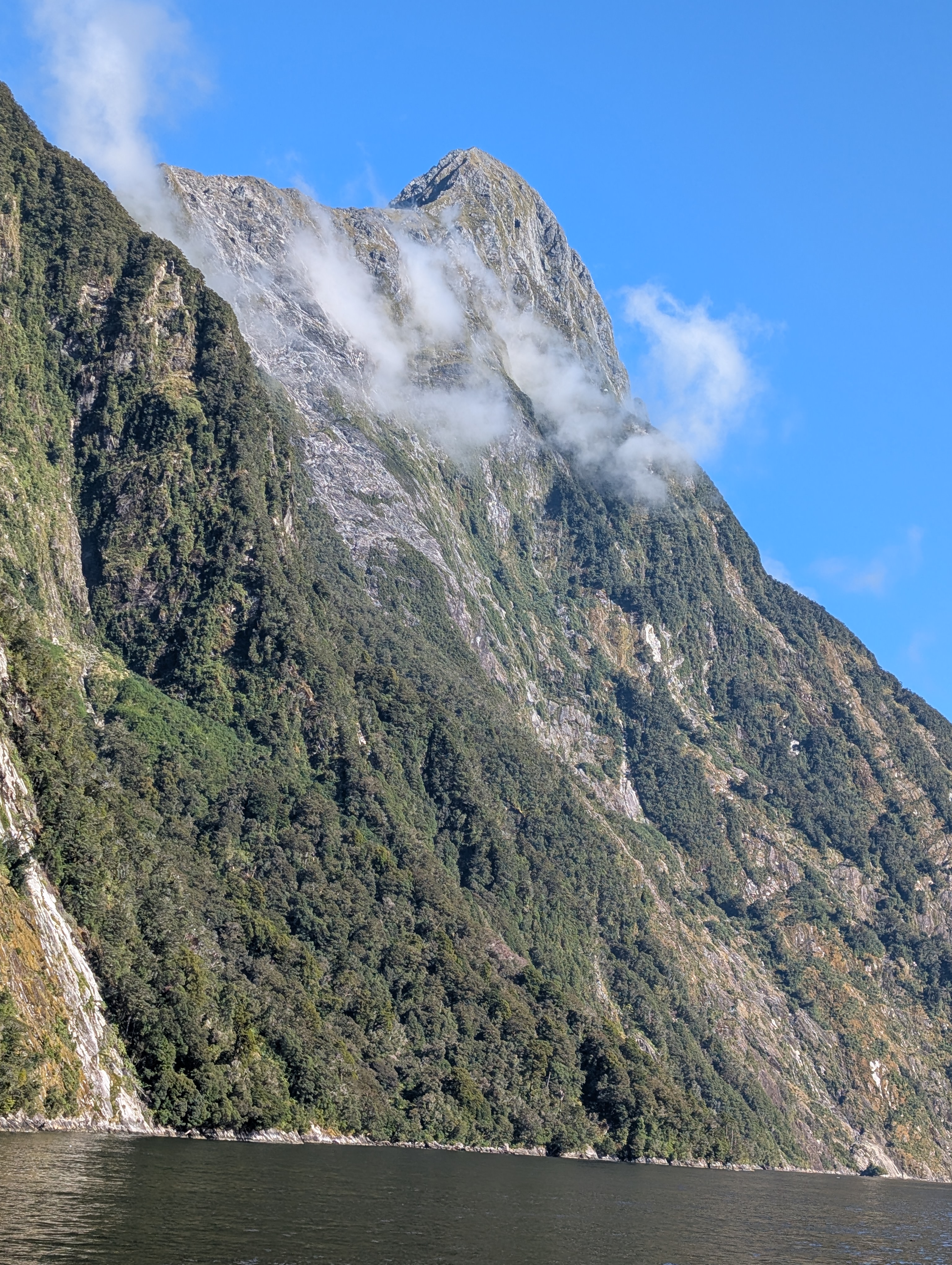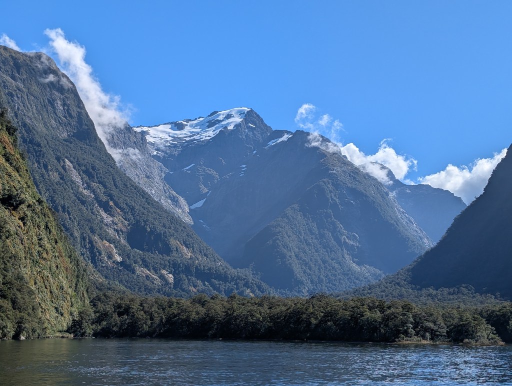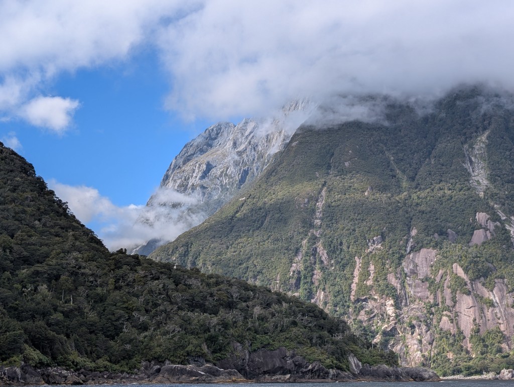 I guess “breathtaking” would be as good a word as any to describe our feelings when we came around one of the last bends in the road before we dropped down into the Sound. The sky was clear, the air soft and inviting. Even the sandflies, which are known to be extremely annoying in the early morning, only required an occasional swipe. How can one not feel very small and insignificant amidst these immense records of time before time.