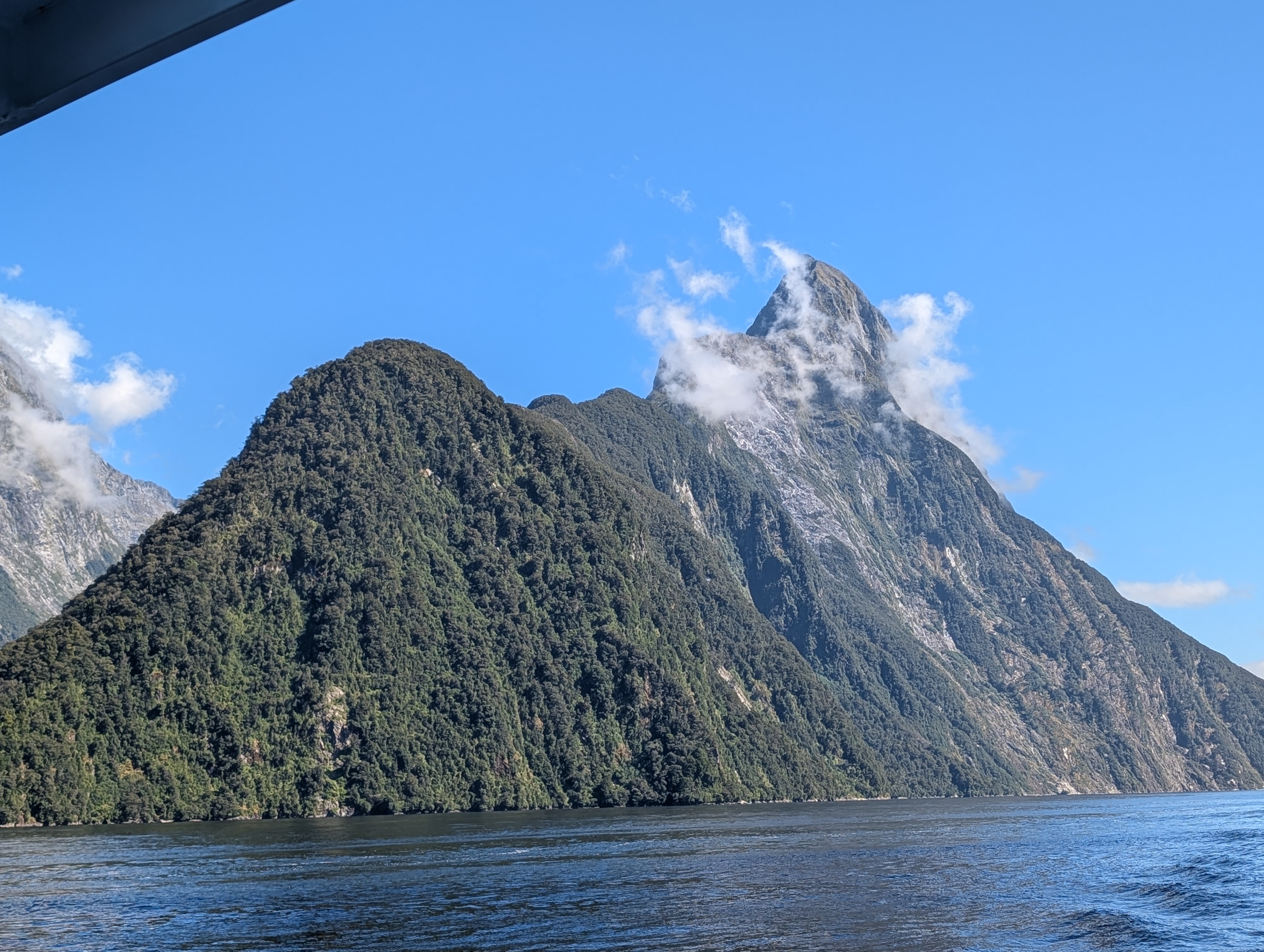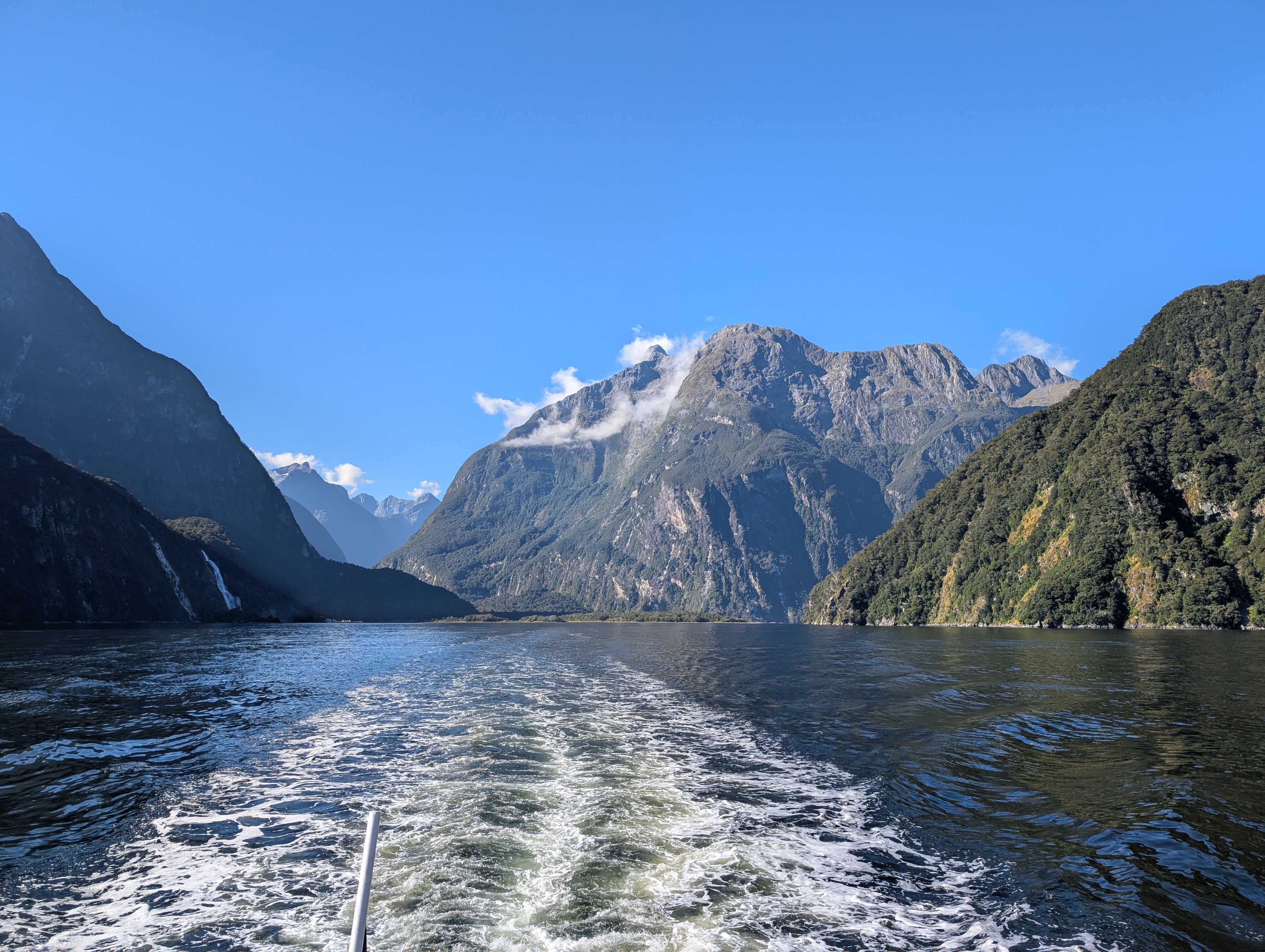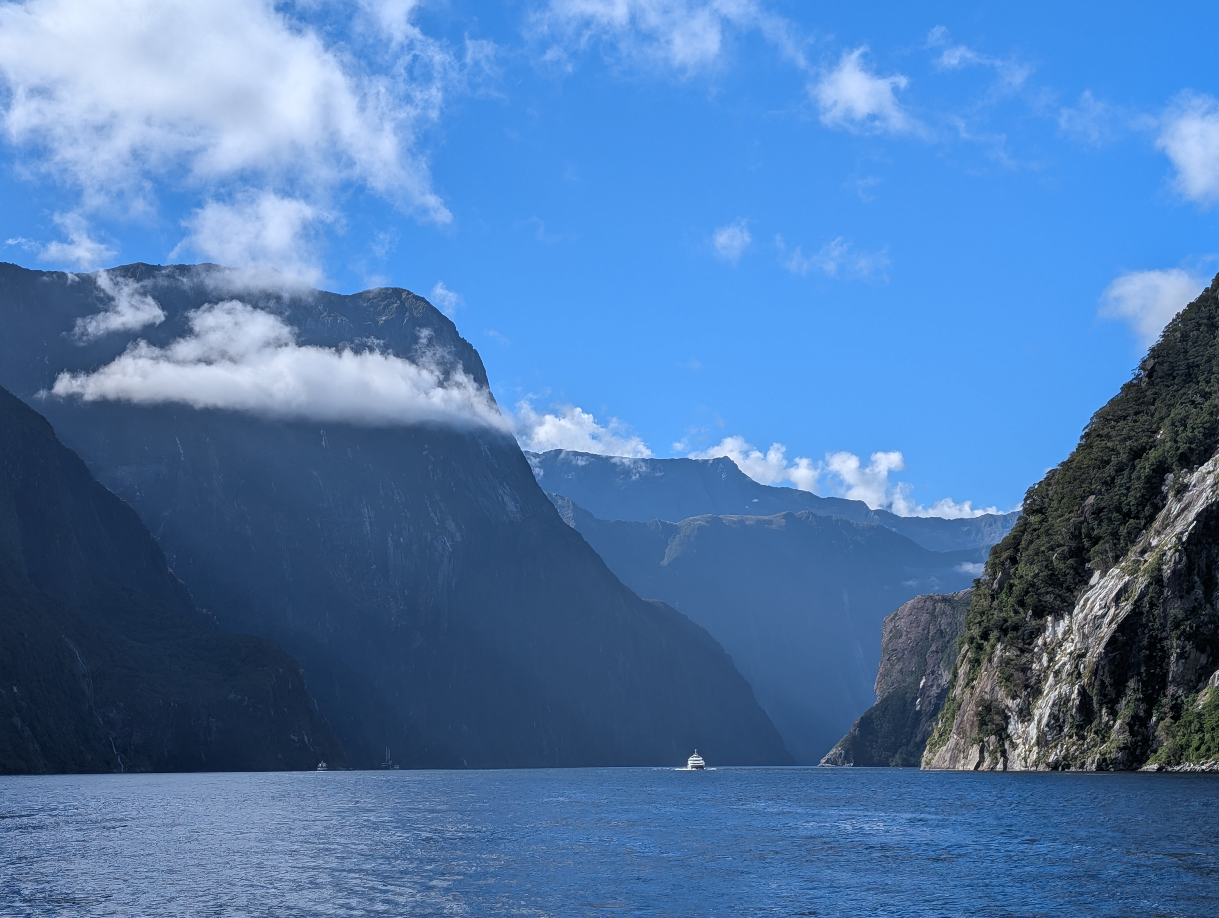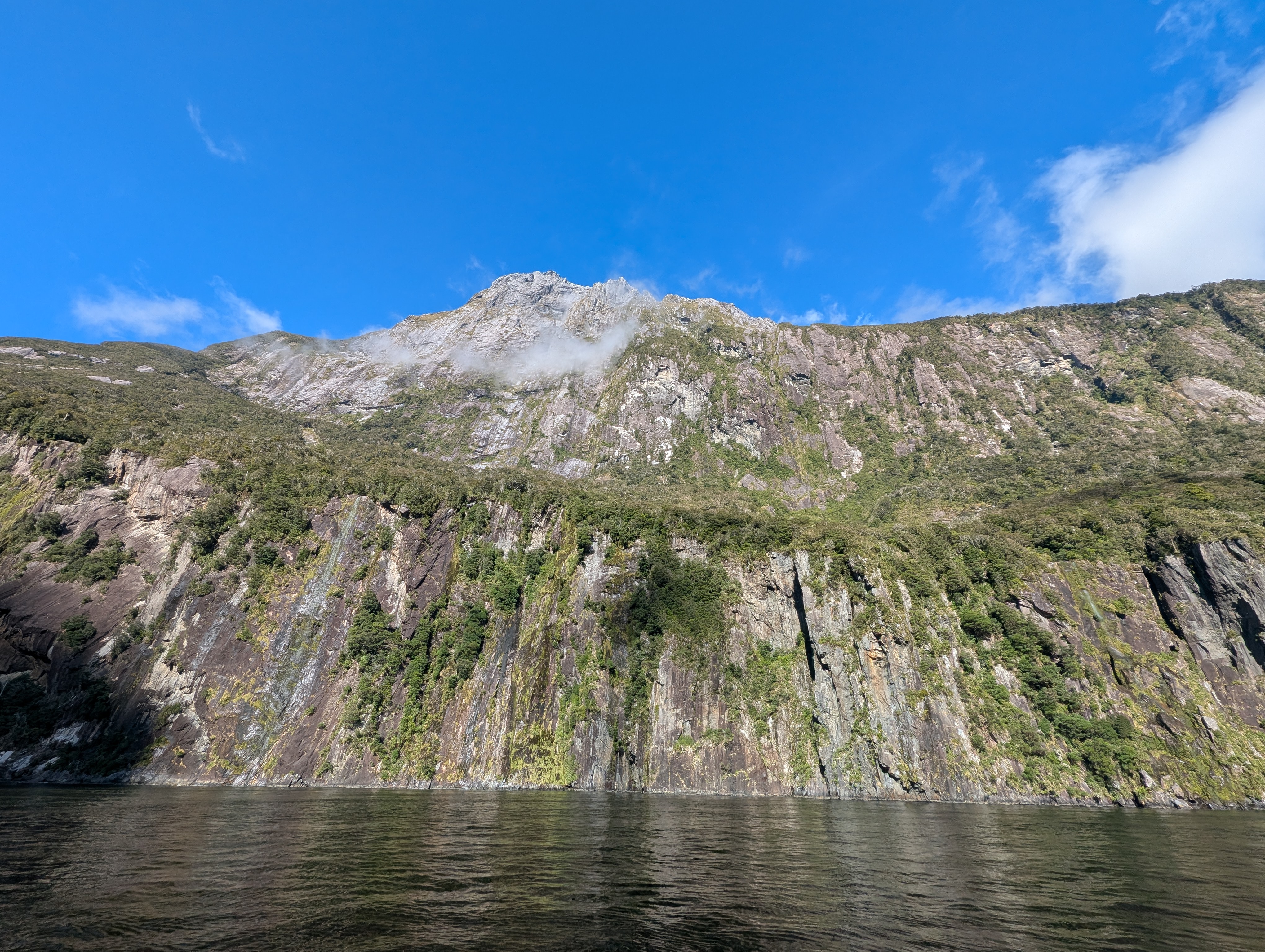 I guess “breathtaking” would be as good a word as any to describe our feelings when we came around one of the last bends in the road before we dropped down into the Sound. The sky was clear, the air soft and inviting. Even the sandflies, which are known to be extremely annoying in the early morning, only required an occasional swipe. How can one not feel very small and insignificant amidst these immense records of time before time.