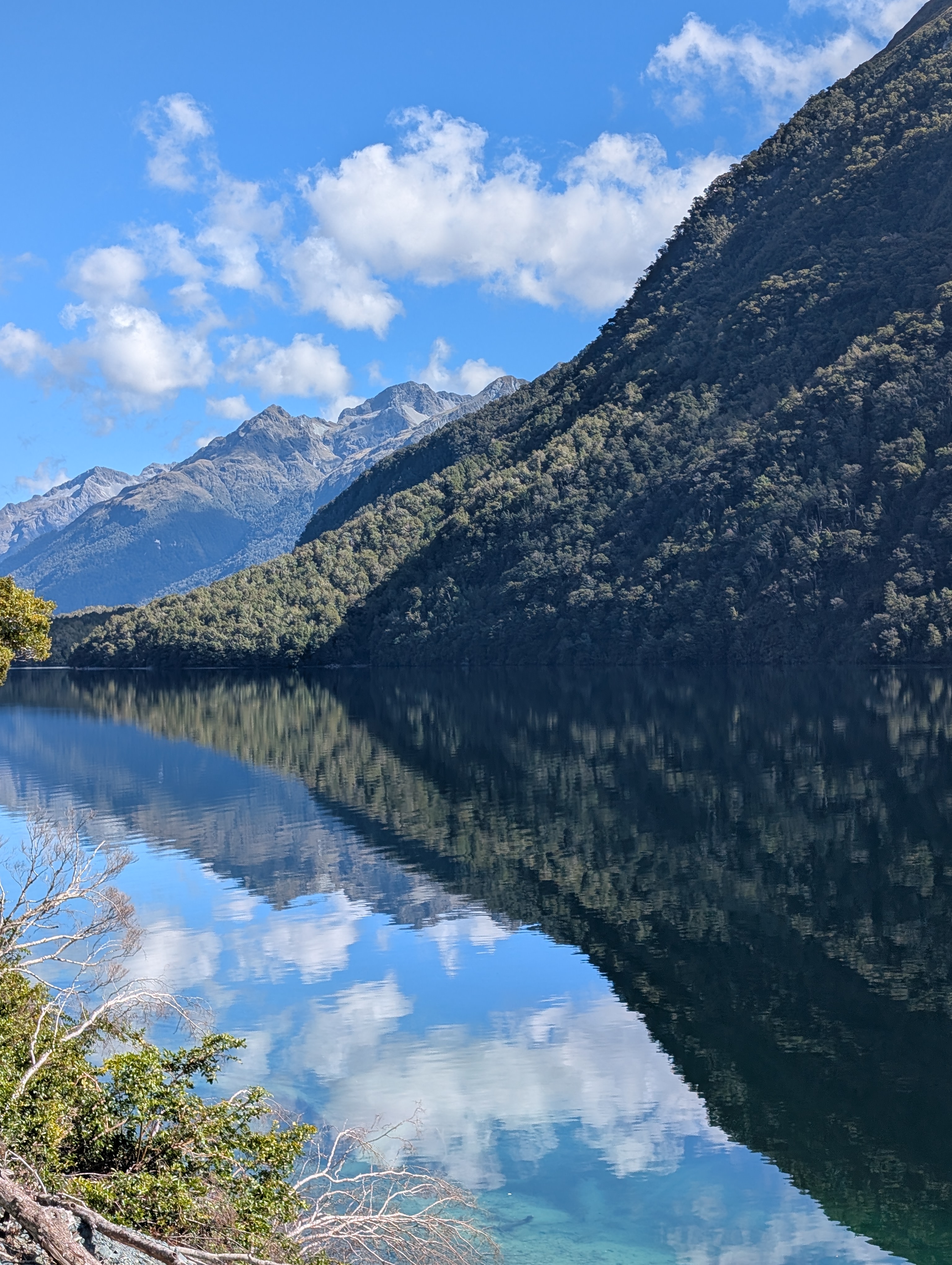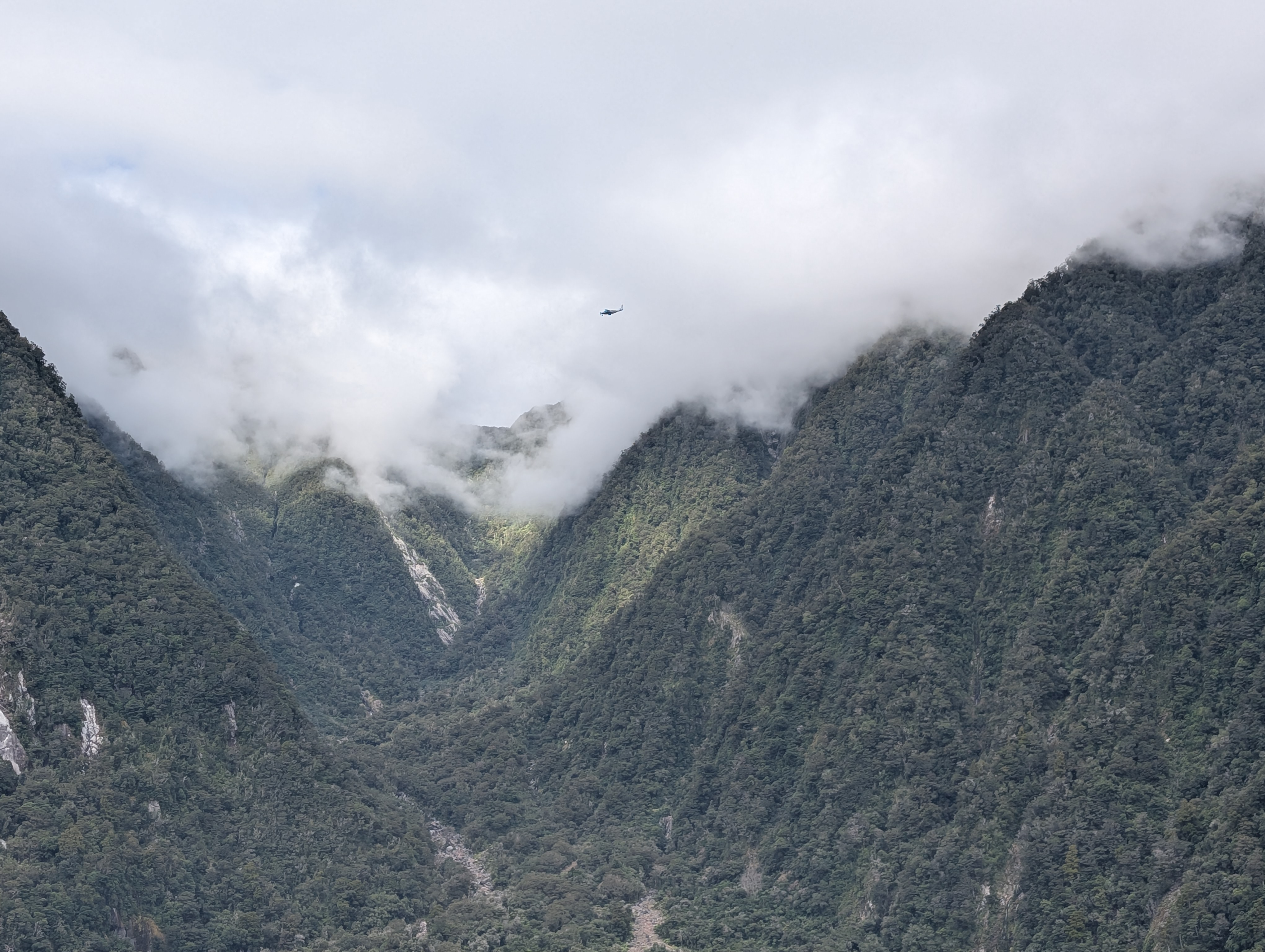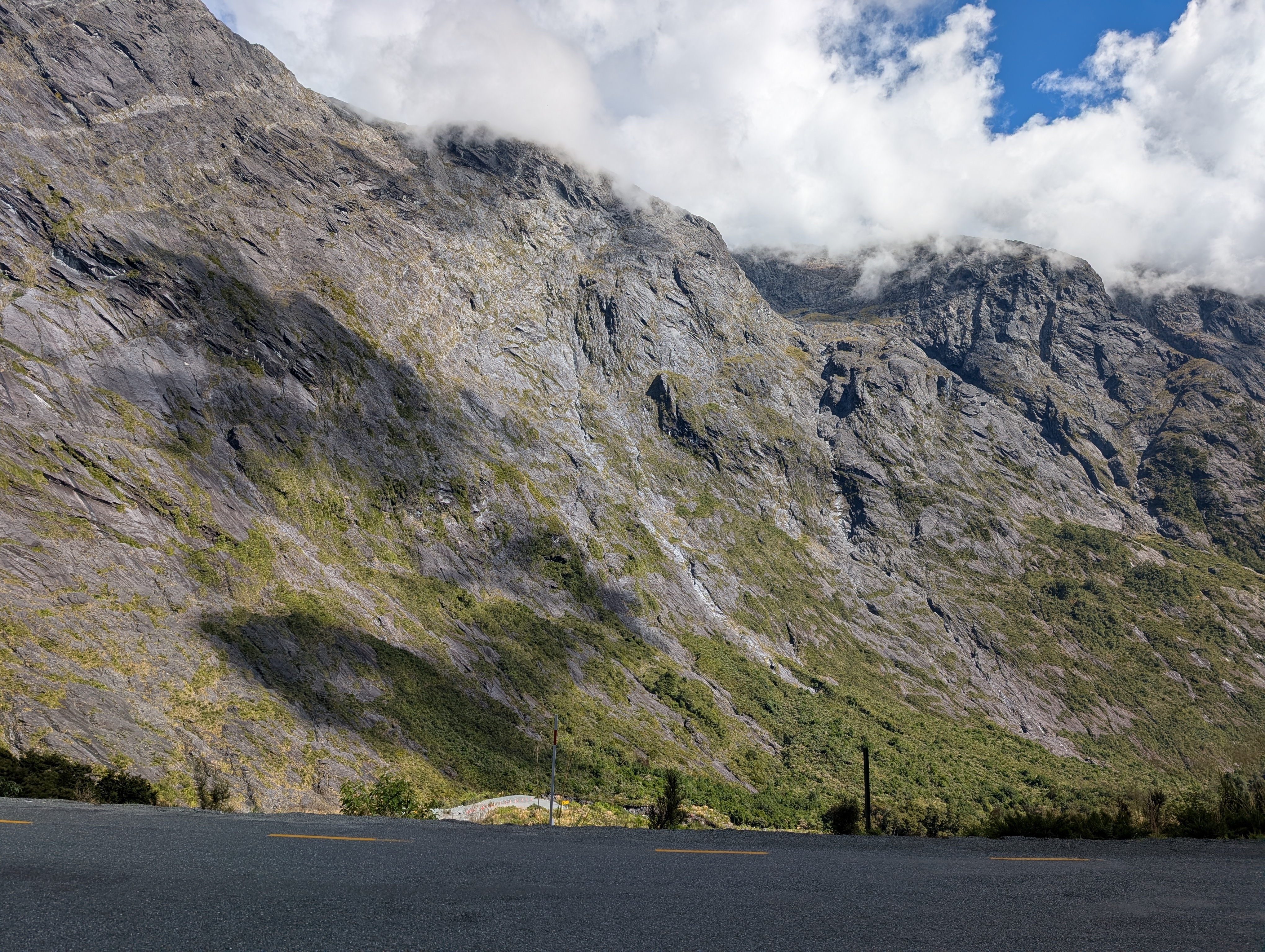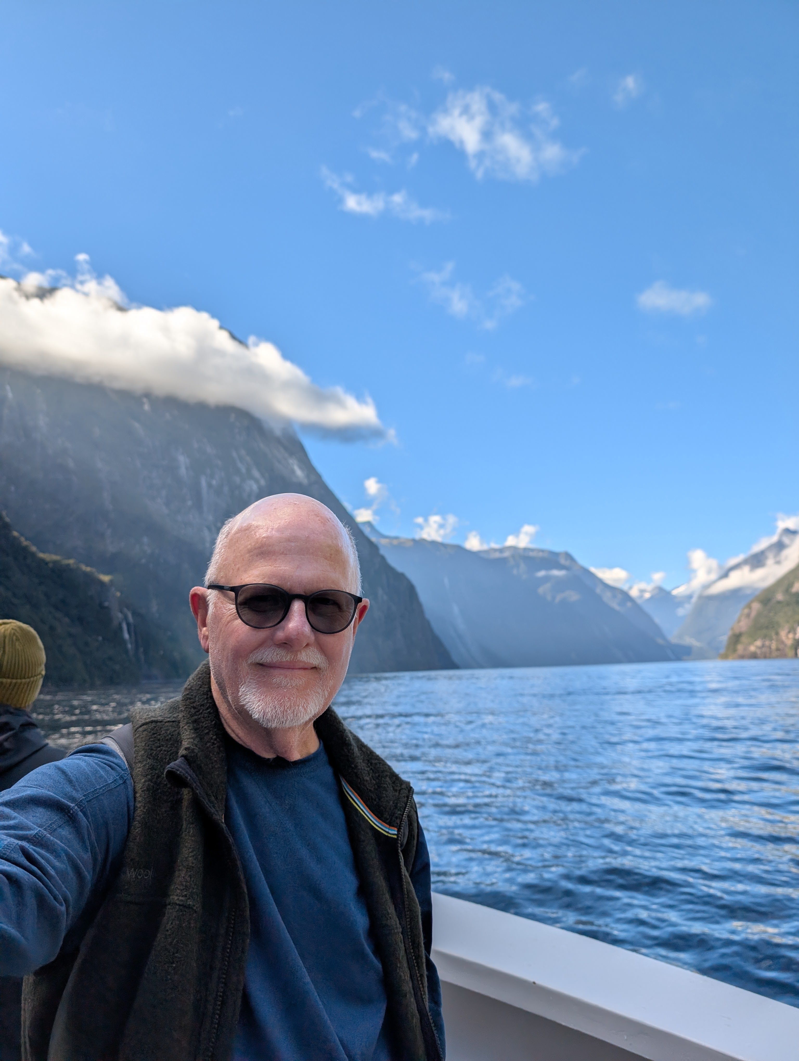 I guess “breathtaking” would be as good a word as any to describe our feelings when we came around one of the last bends in the road before we dropped down into the Sound. The sky was clear, the air soft and inviting. Even the sandflies, which are known to be extremely annoying in the early morning, only required an occasional swipe. How can one not feel very small and insignificant amidst these immense records of time before time.
