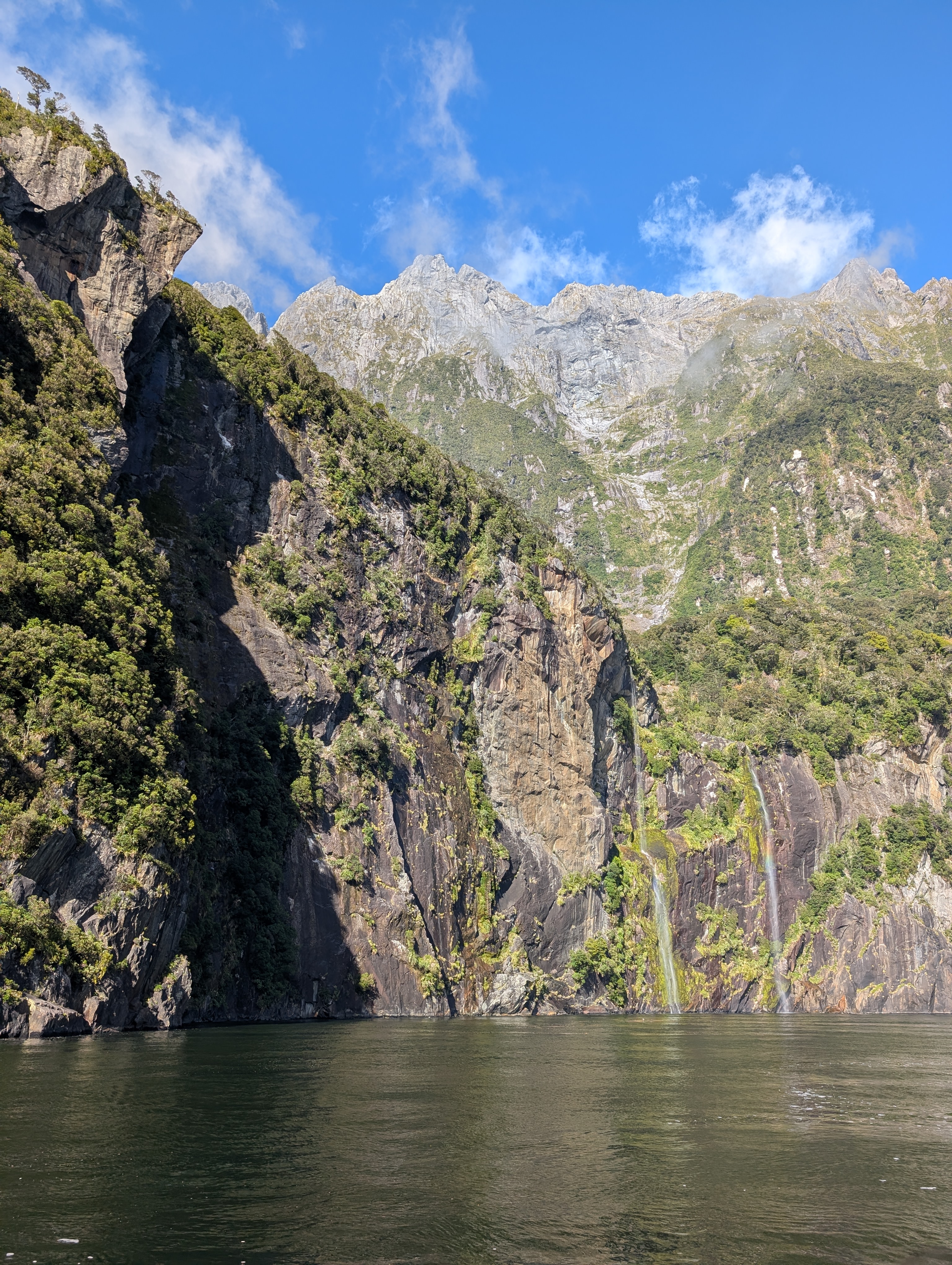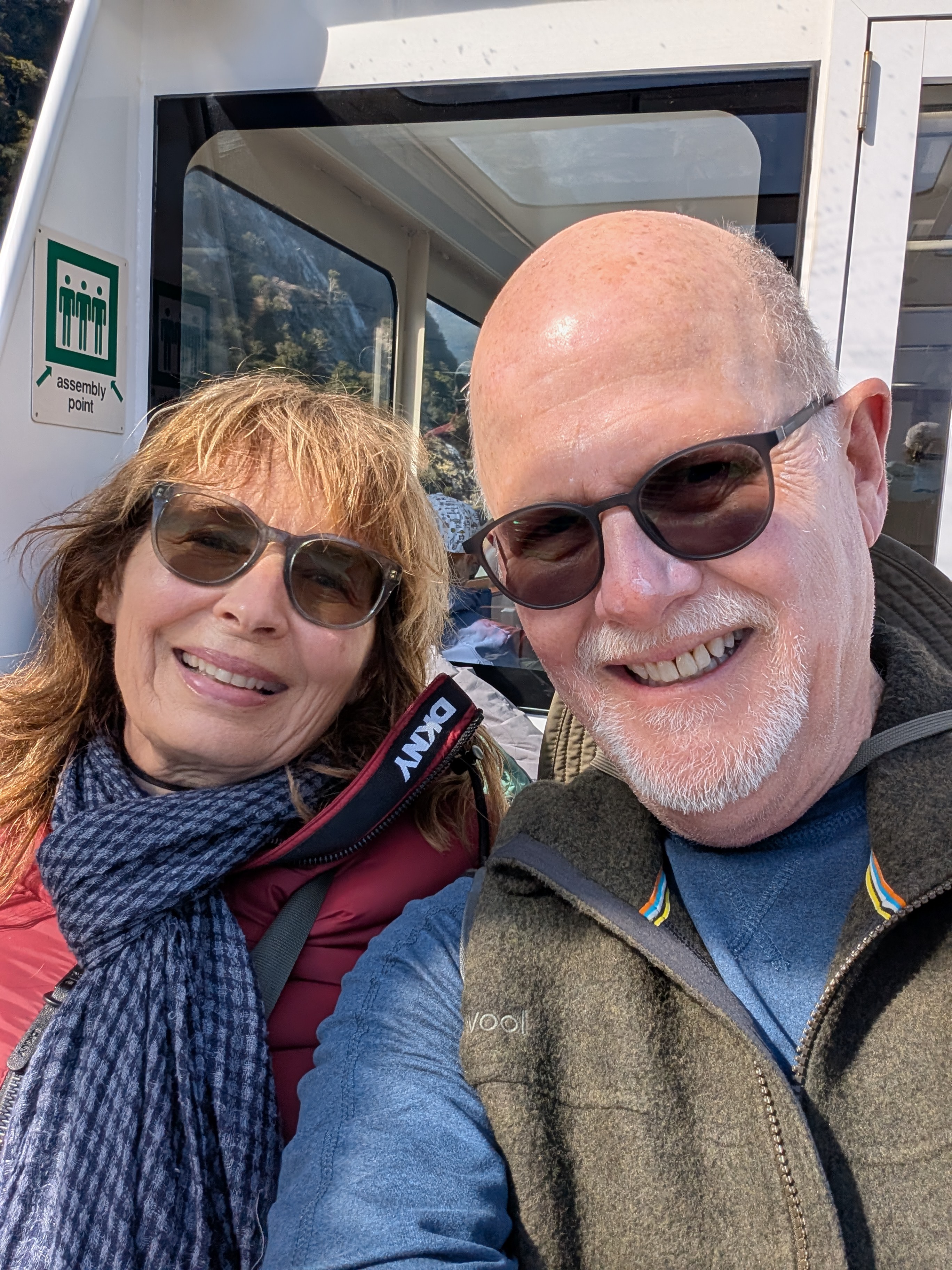 We might describe this as “The Big Show”. Te Anau is the small community on the edge of a beautiful glacier formed lake. The grocery stores are full of food for hikers and campers, because this is a gateway to primordial forests, camping areas, and hiking trails for all levels. This is also the last town on the way to Milford Sound. The photos can in no way capture the size of this ancient fiord. The drive between Te Anau and Milford Sound is two hours with spectacular views and places to stop on the way. But, John made reservations for a cruise on the Sound that began at 10:45 in the morning, so we were on the road before the sun had broken through the morning clouds. Since Milford Sound has rain about 220 days a year, we didn’t know if our luck with good weather would hold.